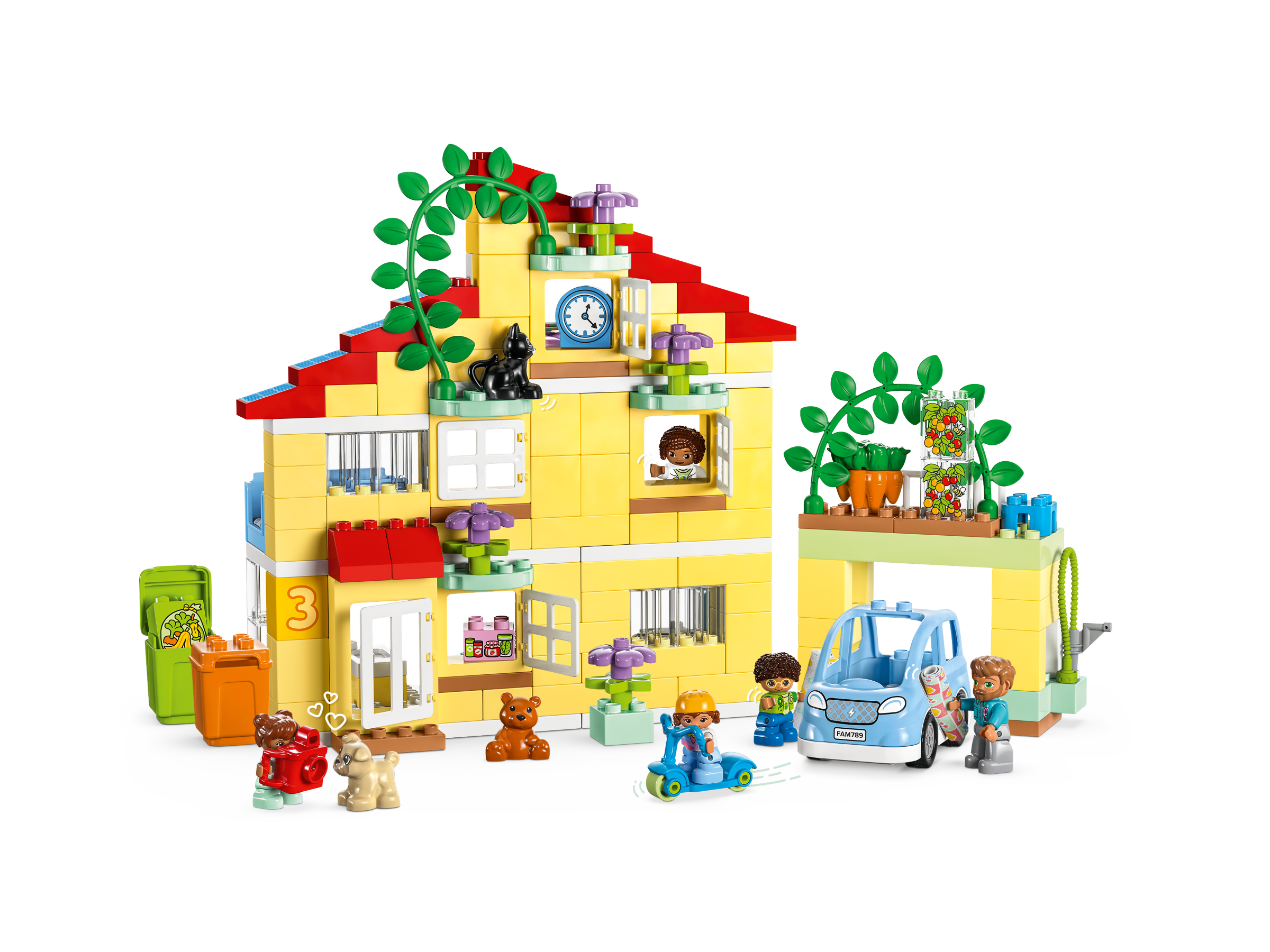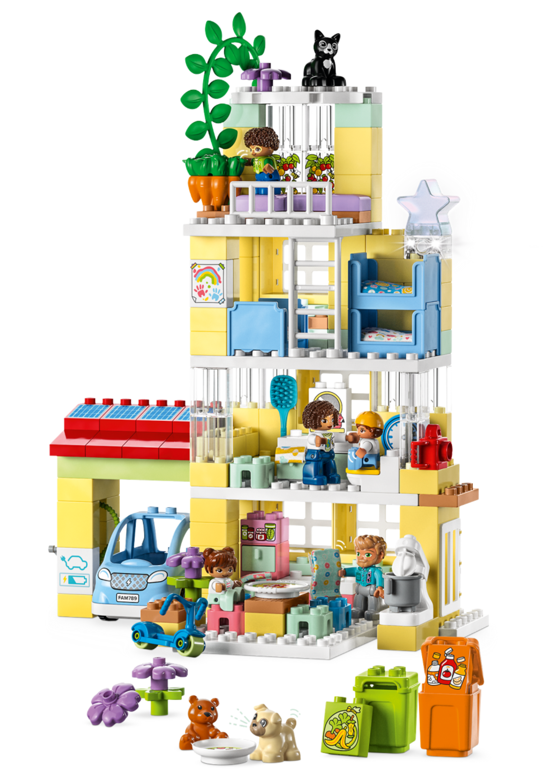 There are a lot of early learning opportunities packed into this toy house. Toddlers play out bedtime routines like toothbrushing and story time tucked up in the toy bunk bed where they can create a cozy mood using the light brick in the star lamp. They learn about healthy food in the kitchen or by picking the toy tomatoes and carrots in the garden. Inside the garage there’s a buildable electric toy car ‘charged’ by solar panels that has a fun push-and-go function for action play.
