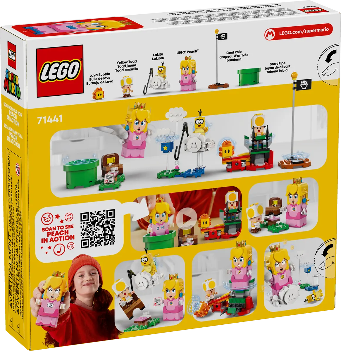 Join an iconic Super Mario™ character for a picnic and fly on a cloud to rescue the Yellow Toad with the Adventures with Interactive LEGO® Peach™ princess toy playset for kids (71441). A top Nintendo® gift for girls, boys and gamers aged 6 and up,the set features an interactive LEGO Peach figure, plus Lakitu, a Yellow Toad and a Lava Bubble. Travel from the Start Pipe to the Goal Pole triggering digital reactions from LEGO Peach and collecting coins along the way. Have a picnic, read a letter saying that the Yellow Toad has been captured, topple Lakitu from the cloud, and fly, flip and loop the loop on the cloud on the way to rescue the Yellow Toad. The buildable cloud toy also has a fishing pole for Lakitu to lift the Yellow Toad’s picnic seat.