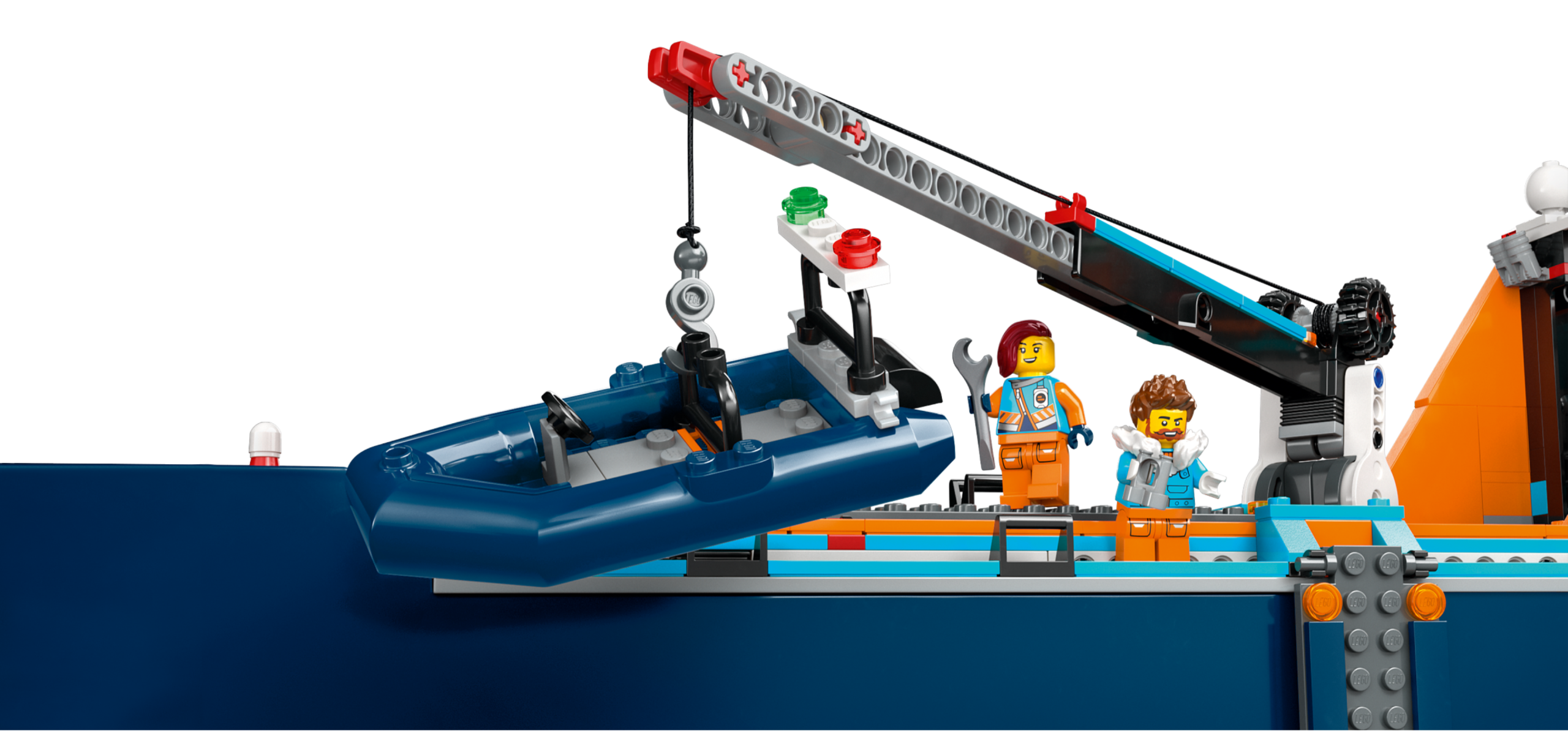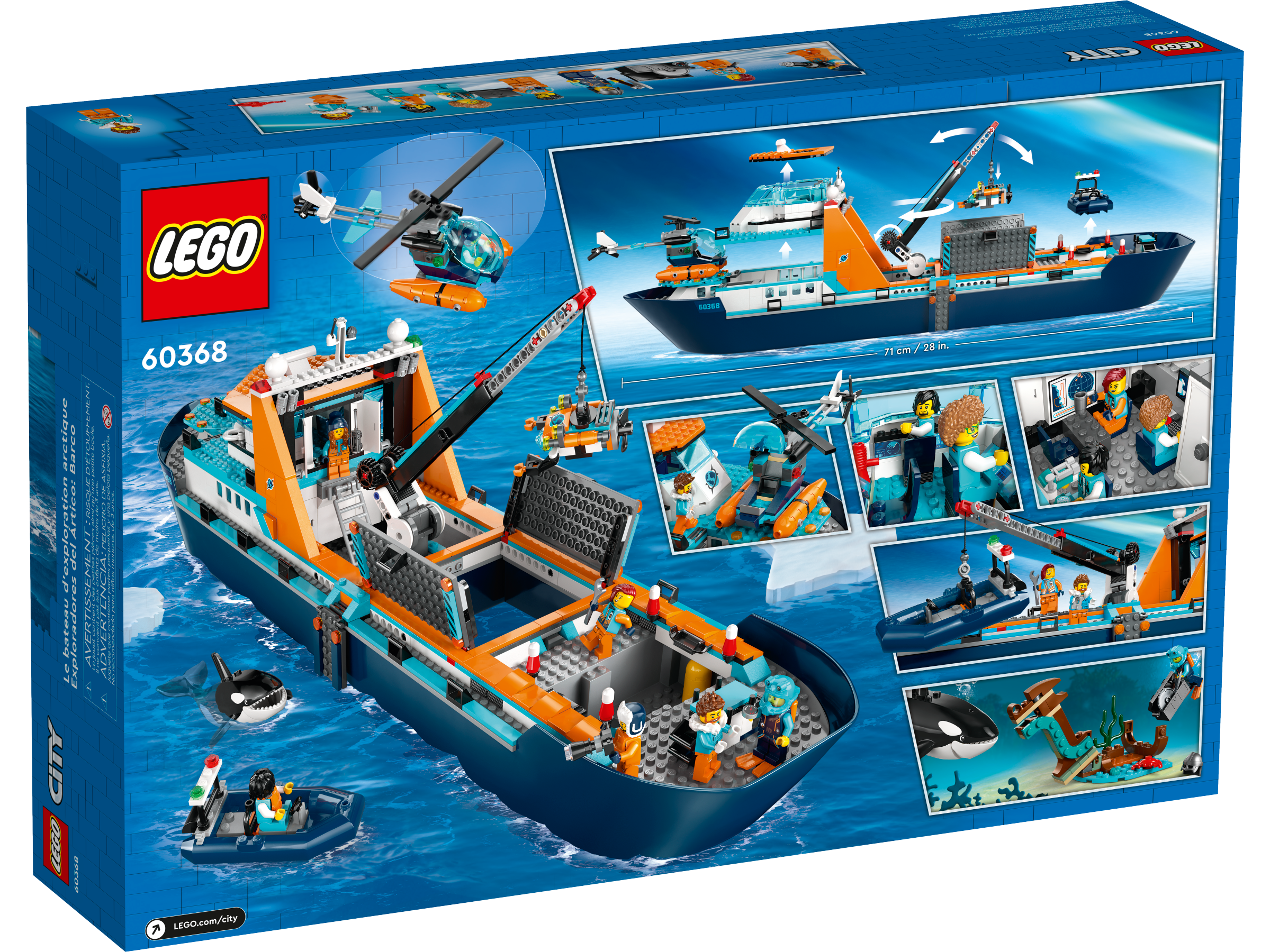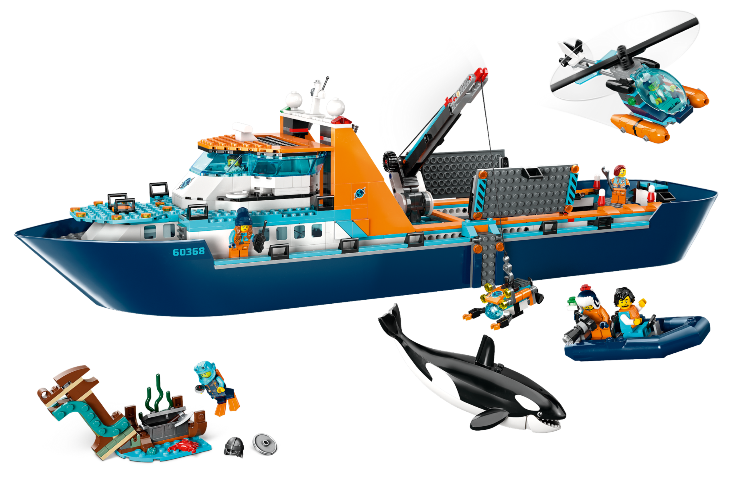 Fun adventures lie on the horizon with the mighty LEGO® City Arctic Explorer Ship (60368). This huge floatable toy boat is loaded with realistic detailing for imaginative exploration adventures. This premium playset also includes a helicopter, dinghy, underwater ROV sub and a Viking shipwreck, plus a treasure chest, 7 minifigures and an orca figure.