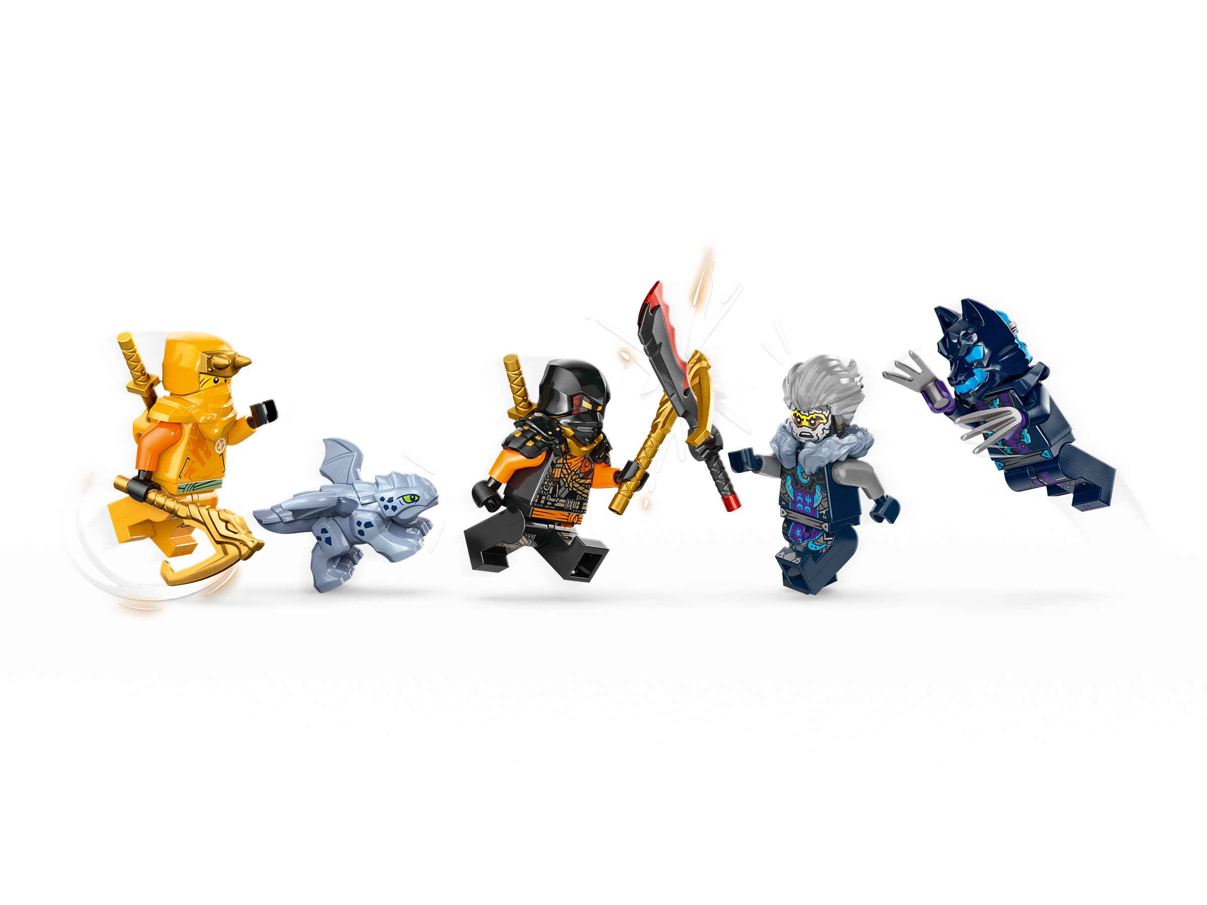 The ninja toy comes with a Baby Riyu model and 4 NINJAGO minifigures: Climber Colewith climbing hook and katana sword accessories, Arin with climbing hook and katana sword accessories, a Wolf Mask Claw Warrior with claws, and Cinder with a sword accessory.