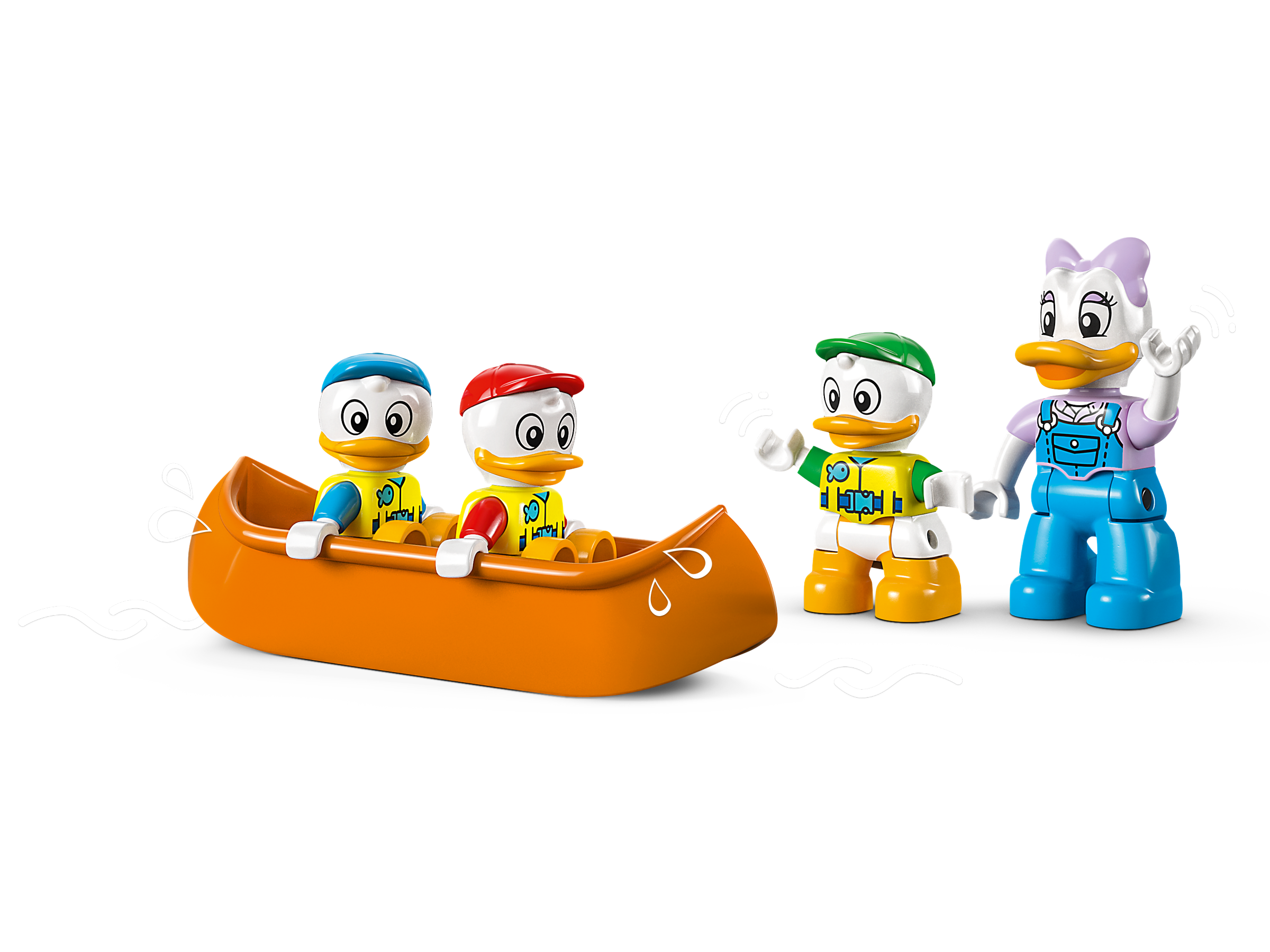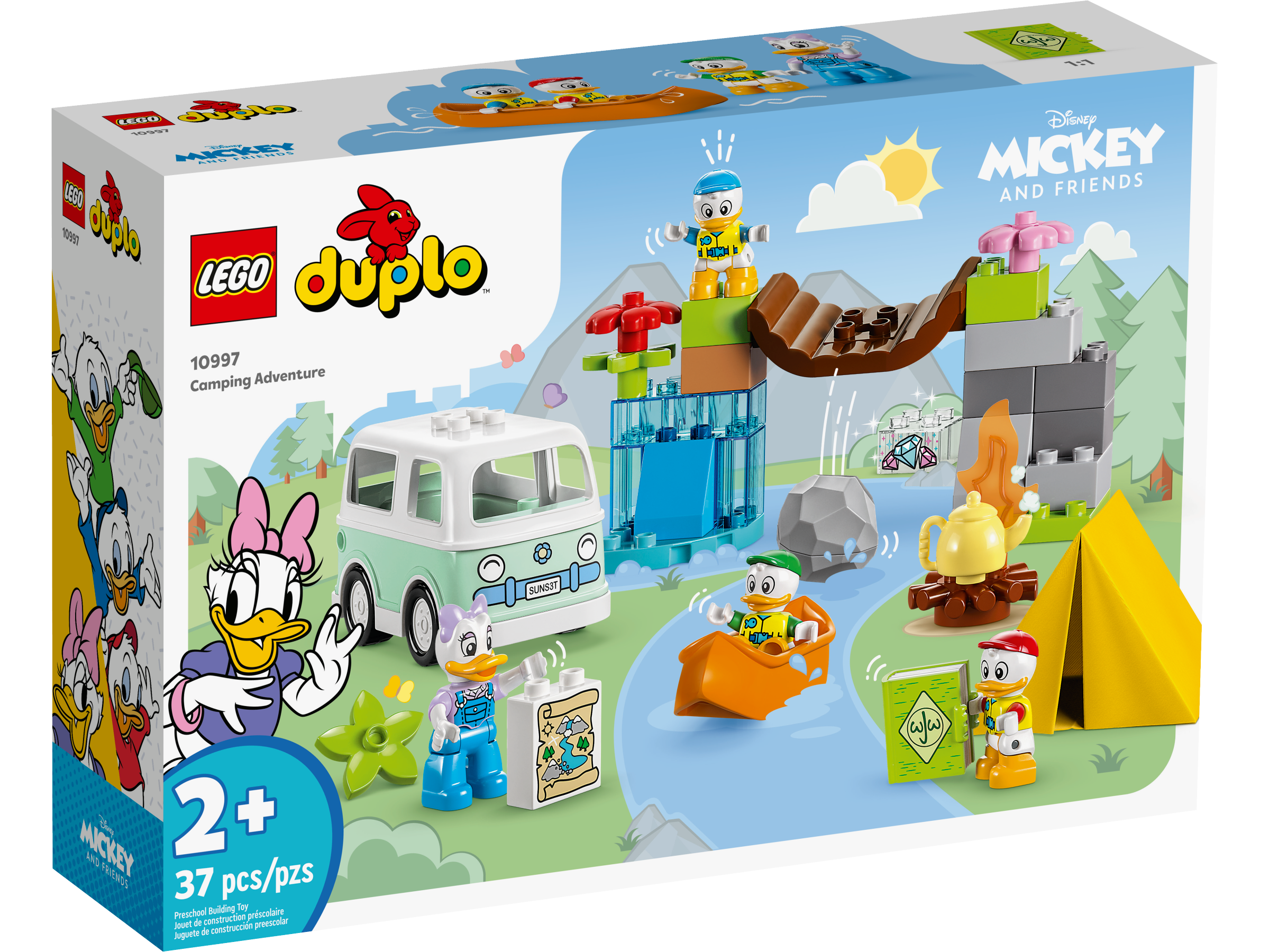 Toddlers set off on an outdoor adventure with Daisy Duck and Huey, Dewey and Louie in a drivable camper van. They find a treasuremap and navigate the river in their canoe, past the wobbly bridge that threatens to tip a boulder into the water. They discover the treasure behind the buildable waterfall toy, then make a campfire and snuggle up in the tent.