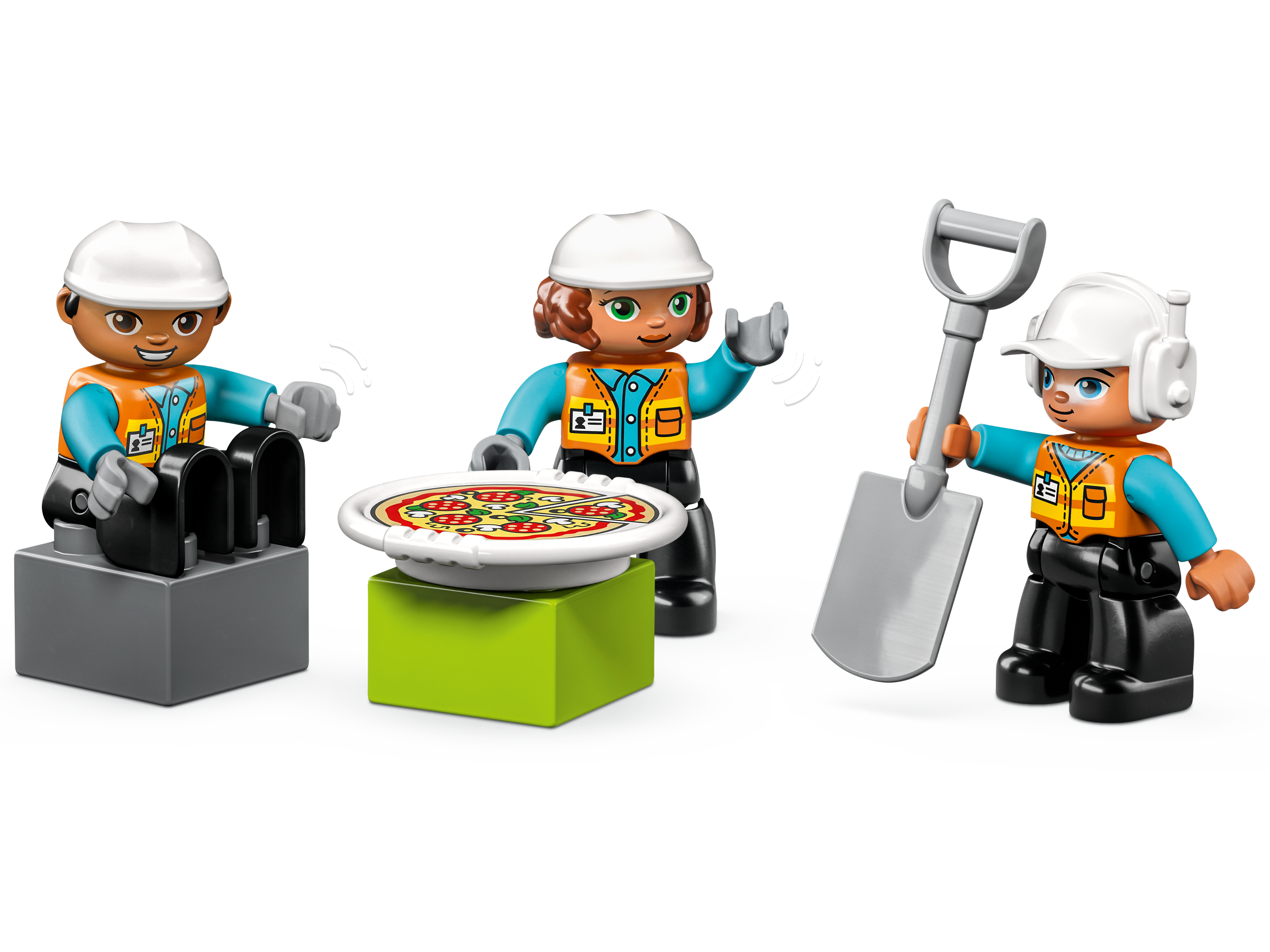 Lay the foundations for strong building skills with the LEGO® DUPLO® Town Construction Site (10990) toy. This feature-rich set is packed with details to inspire role play and help develop self-expression. Toddlers aged 2 learn about teamwork as the trio of toy construction site workers operate the 3 vehicles. The bulldozer brings the boulder and the crane grabs it and carries it to the chute where it slides down into the cement mixer. When the work is over there’s a tasty pizza to reward the construction workers for a job well done.