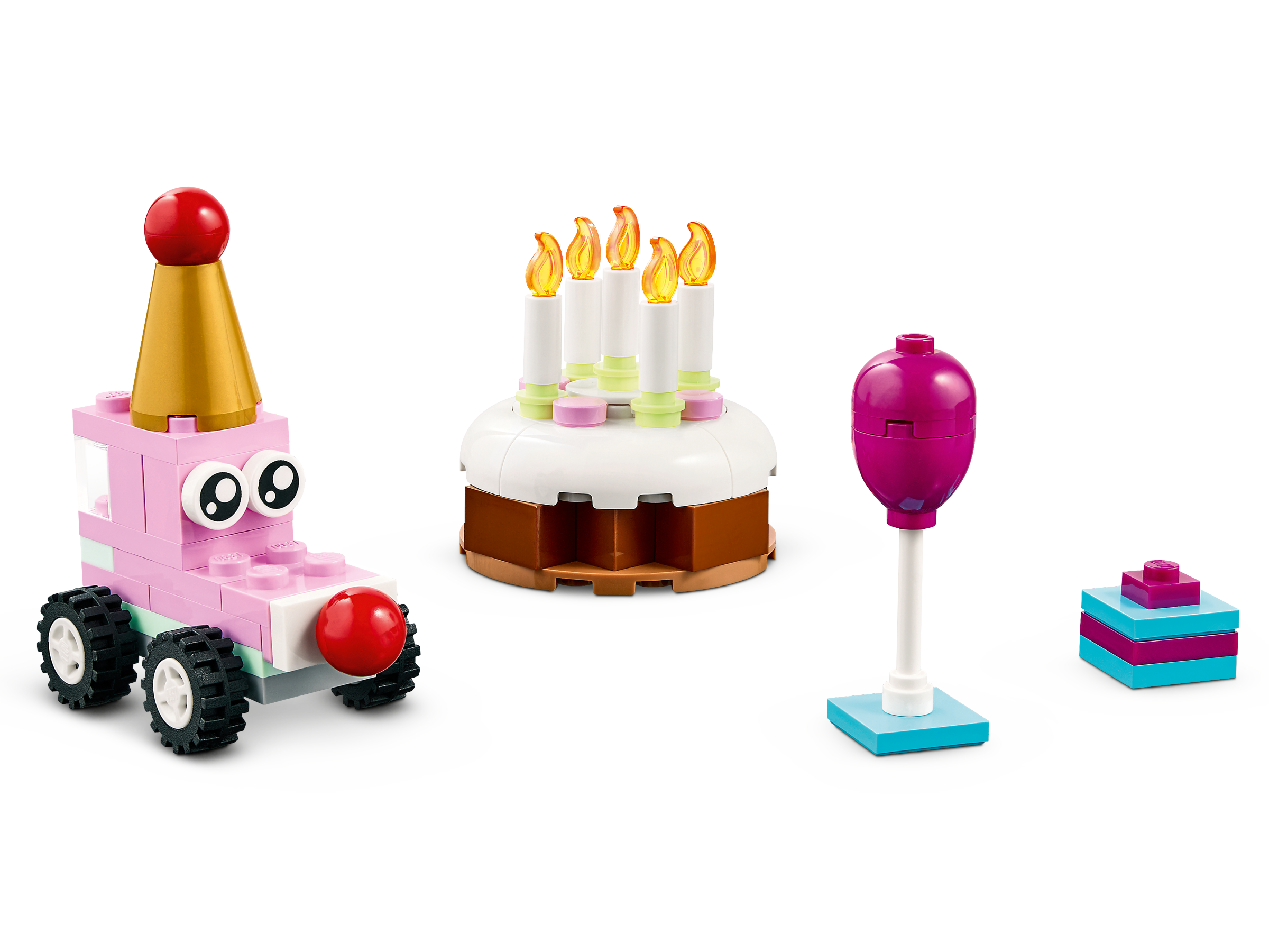 Share creative fun with this colorful collection of building bricks. The pieces are grouped into 6 bags, each containing the bricks and clear printed building instructions to make 2 easy-to-build models. Models include a teddybear, clown, unicorn, piñata, rainbow, cake, popcorn, balloons and small presents. It’s a great group activity for any celebration – and when the event is over, the creative building needn’t stop! A digital version of the set’s building instructions can also be found within the LEGO Builder app.