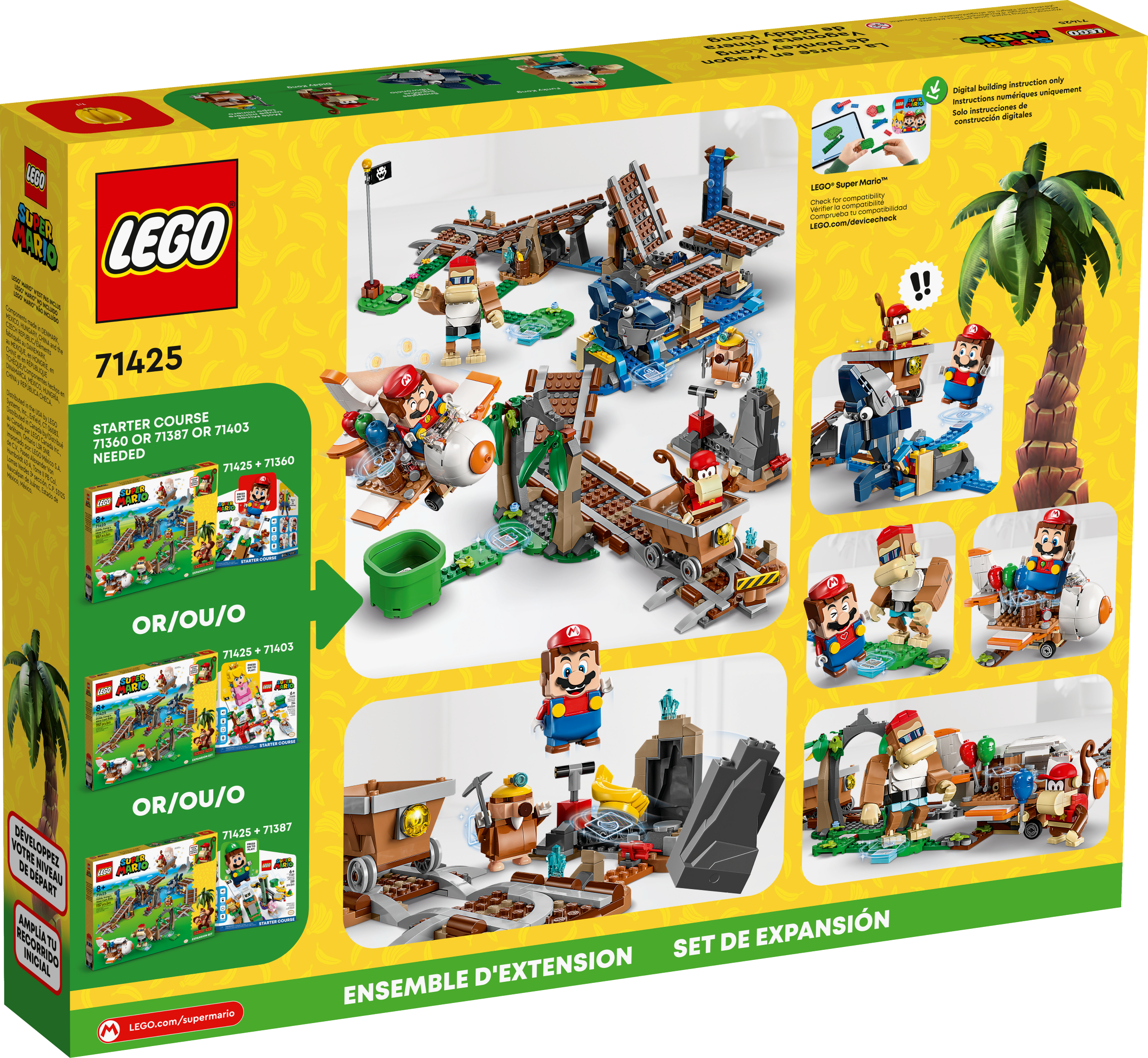 Create an iconic Donkey Kong™ level in the brick-built LEGO® Super Mario™ universe with this Diddy Kong’s Mine Cart Ride Expansion Set (71425) for kids. Place a LEGO® Mario™, LEGO® Luigi™ or LEGO® Peach™ figure (not included) in the mine cart to ride around the track. Flip the Snaggles out of the way, fix the broken section of track, defeat the Mole Miner and ‘explode’ the rock to reveal a bunch of bananas to ‘eat’ or gift to Funky Kong or Diddy Kong. Buy balloons from the aeroplane shop and ‘fly’ the plane to earn more digital coins. Note: the 71360, 71387 or 71403 Starter Course is required for interactive play.