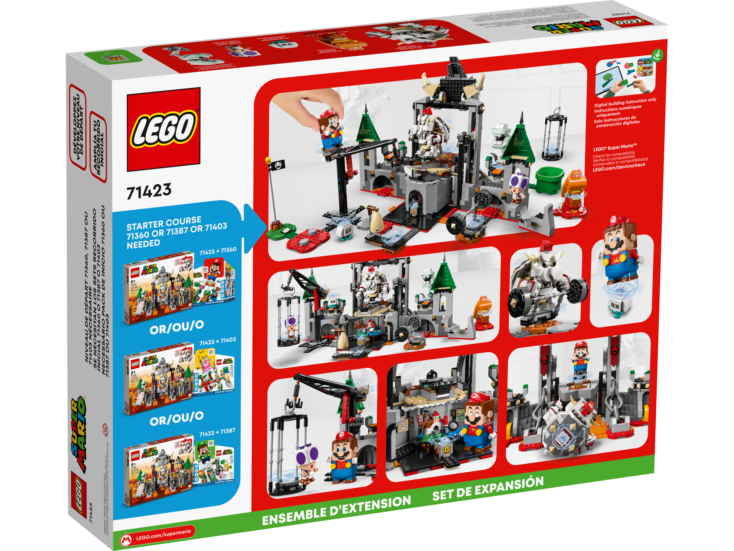 Create a fantastic LEGO® brick version of an iconic location in the Super Mario™ universe with the Dry Bowser Castle Battle Expansion Set (71423). Players can explore the castle with their interactive LEGO® Peach™, LEGO® Mario™ or LEGO® Luigi™ figure (not included). It features an opening Bowser-jaw-shaped entrance, a crane to rescue the Purple Toad from the trap and topple Dry Bowser, flippers to defeat the Bone Piranha Plant and Bone Goomba, a Magmaargh attack function, gym, secret entrance, secret strategy room, Key Block and a Treasure Chest Block. Note: an interactive set (71439, 71440 and 71441, sold separately) is needed for interactive play.