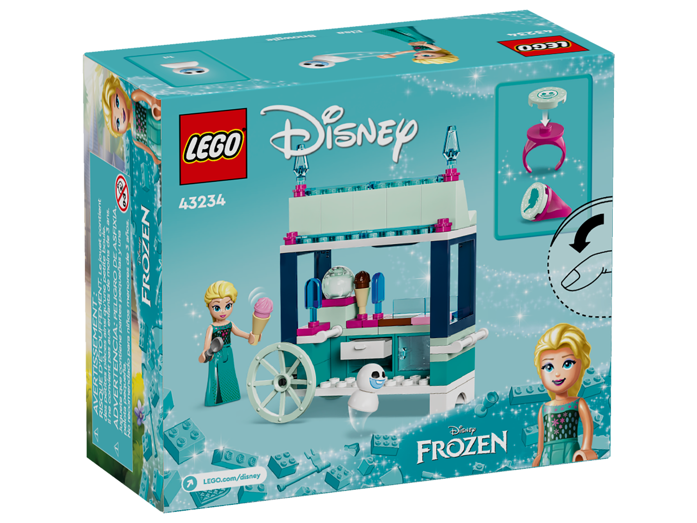 Captivate Disney fans and kids aged 5 and over with this LEGO® ǀ Disney Frozen Elsa’s Frozen Treats (43234) building toy set. The box contains a buildable ice-cream cart with an ice-cream maker, 2 ice-cream cones, 2 ice lollies and other story starters. It includes an Elsa LEGO ǀ Disney mini-doll figure and a Snowgie LEGO ǀ Disney figure to get the role play started, plus 2 collectible rings with interchangeable decorations.