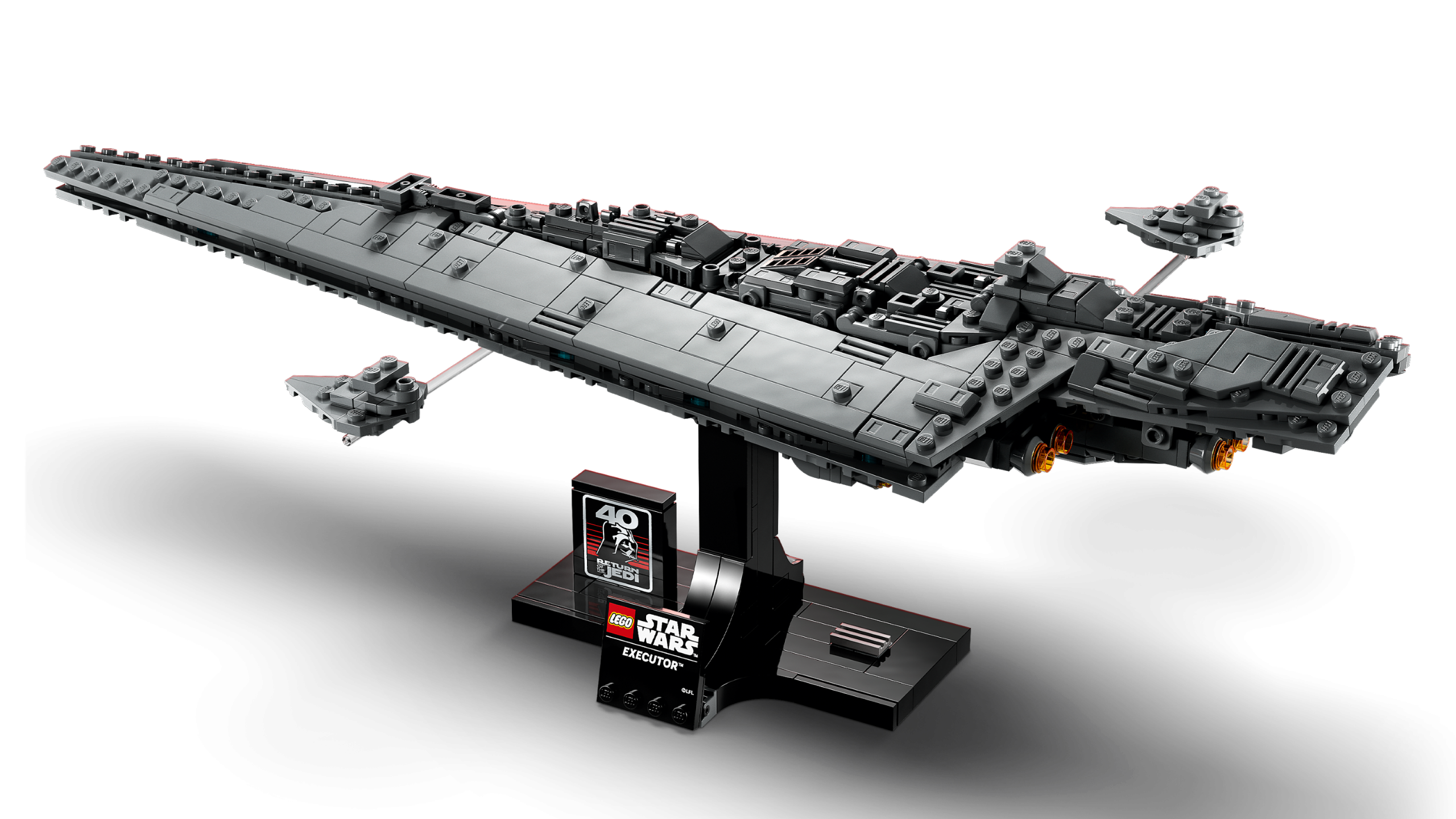 Place the Executor Super Star Destroyer on the display stand, which has a nameplate and Star Wars: Return of the Jedi 40th anniversary plaque. Measuring over 43 cm (17 in.) long, this starship is the perfect size to display on a desk or shelf.