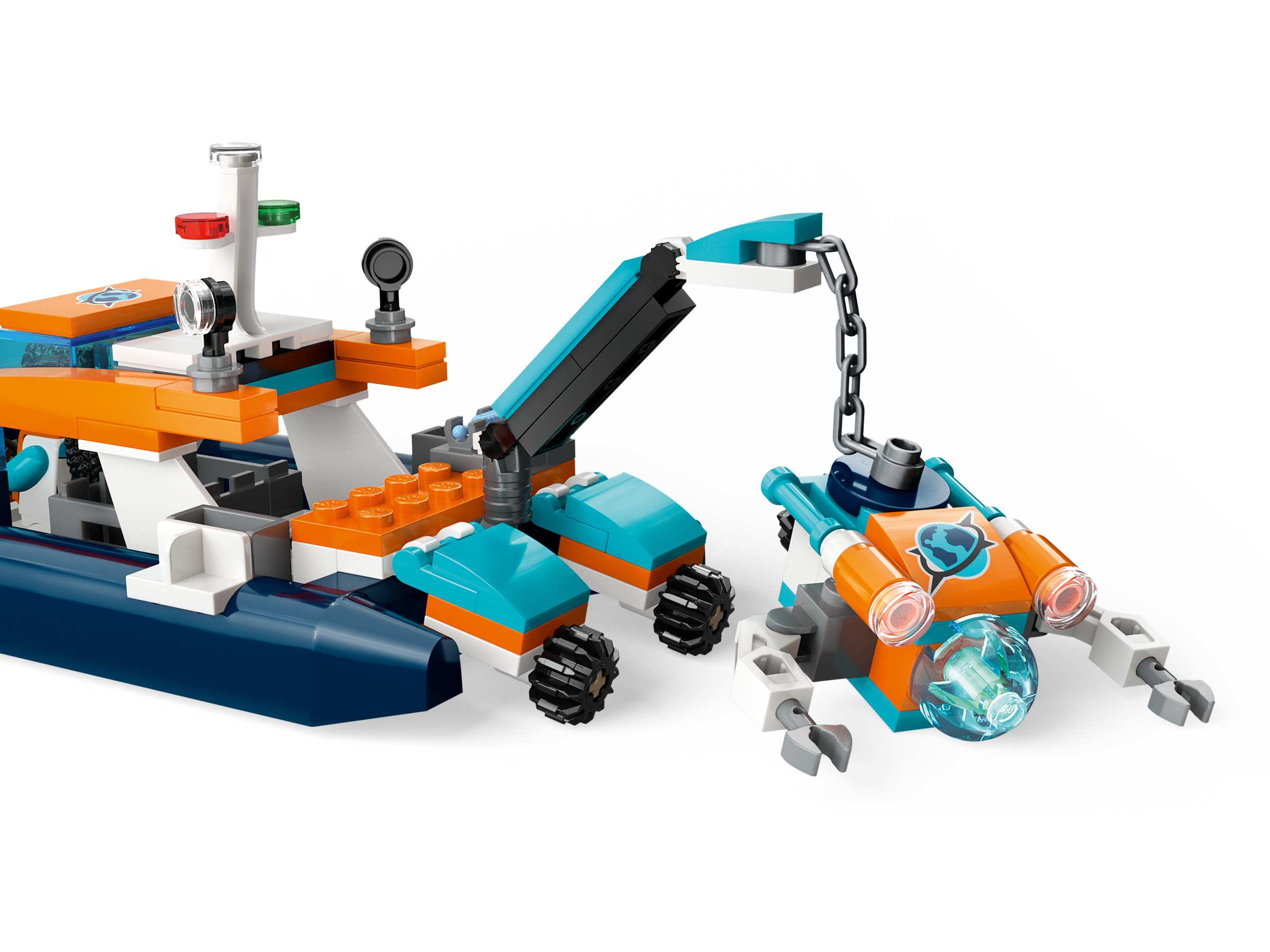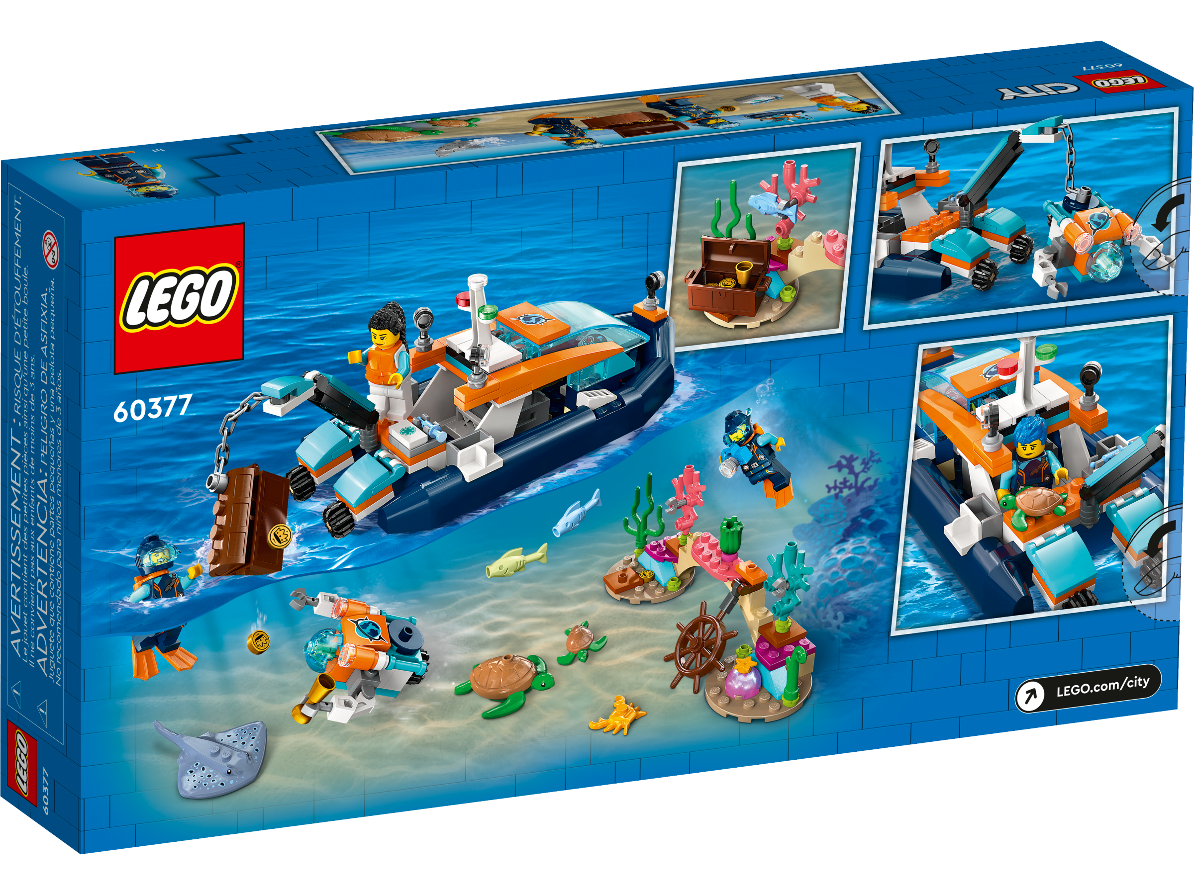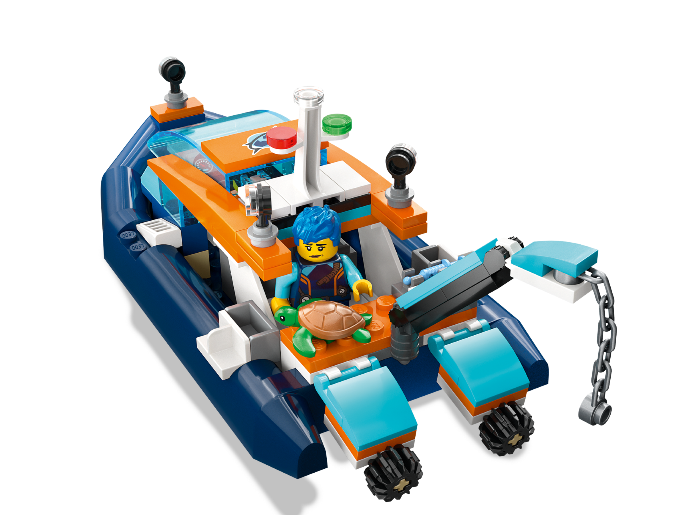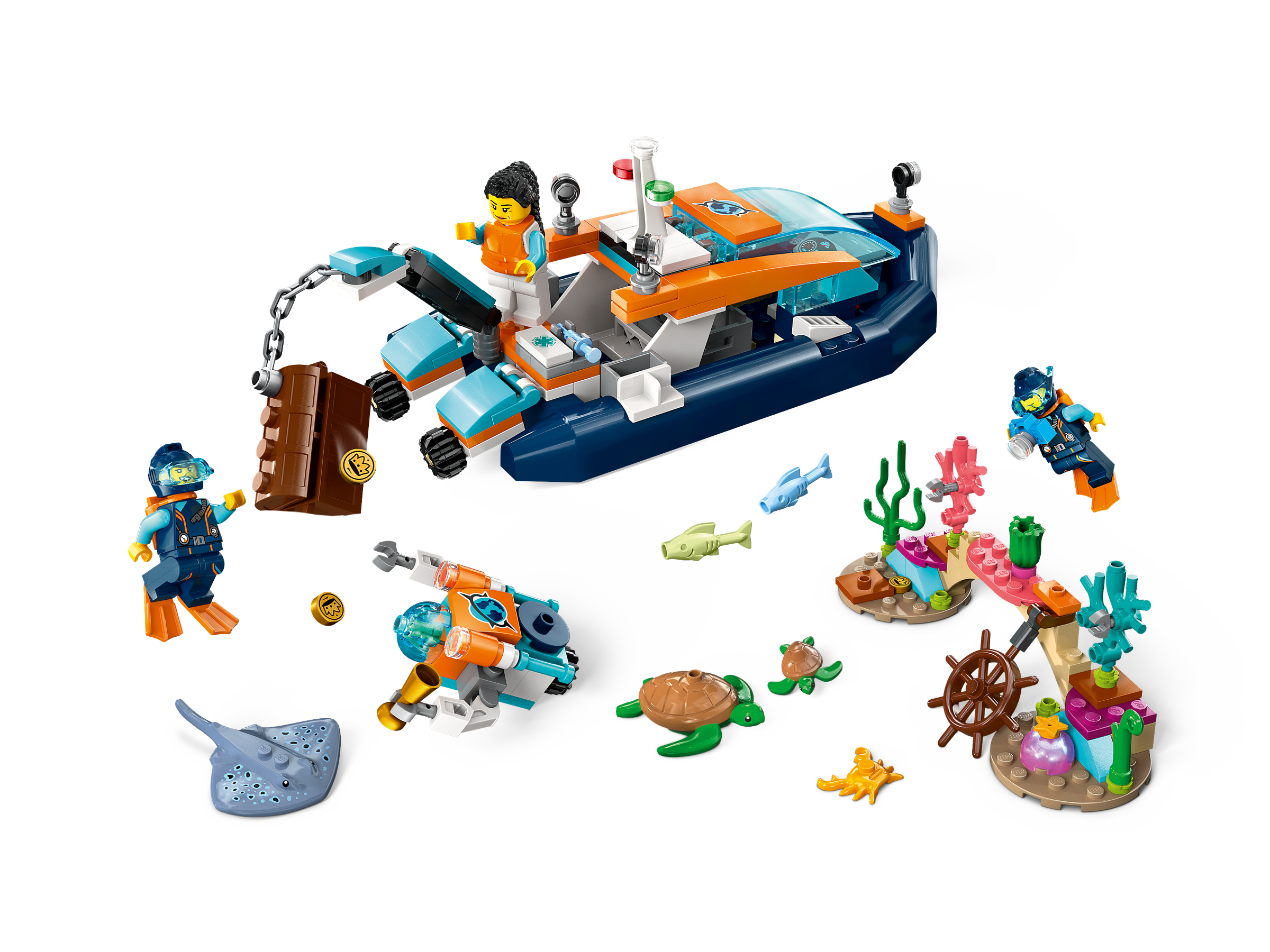 Endless imaginative adventures await with this 5 LEGO® City Explorer Diving Boat (60377) playset. The inflatable toy boat comes with lots of realistic features, including a working crane. The set also features a mini-submarine, coral reef setting and a treasure chest. There are 3 explorer minifigures and manta ray, hammerhead shark, crab, 2 fish and 2 turtle figures as well as lots of story-inspiring accessories.
