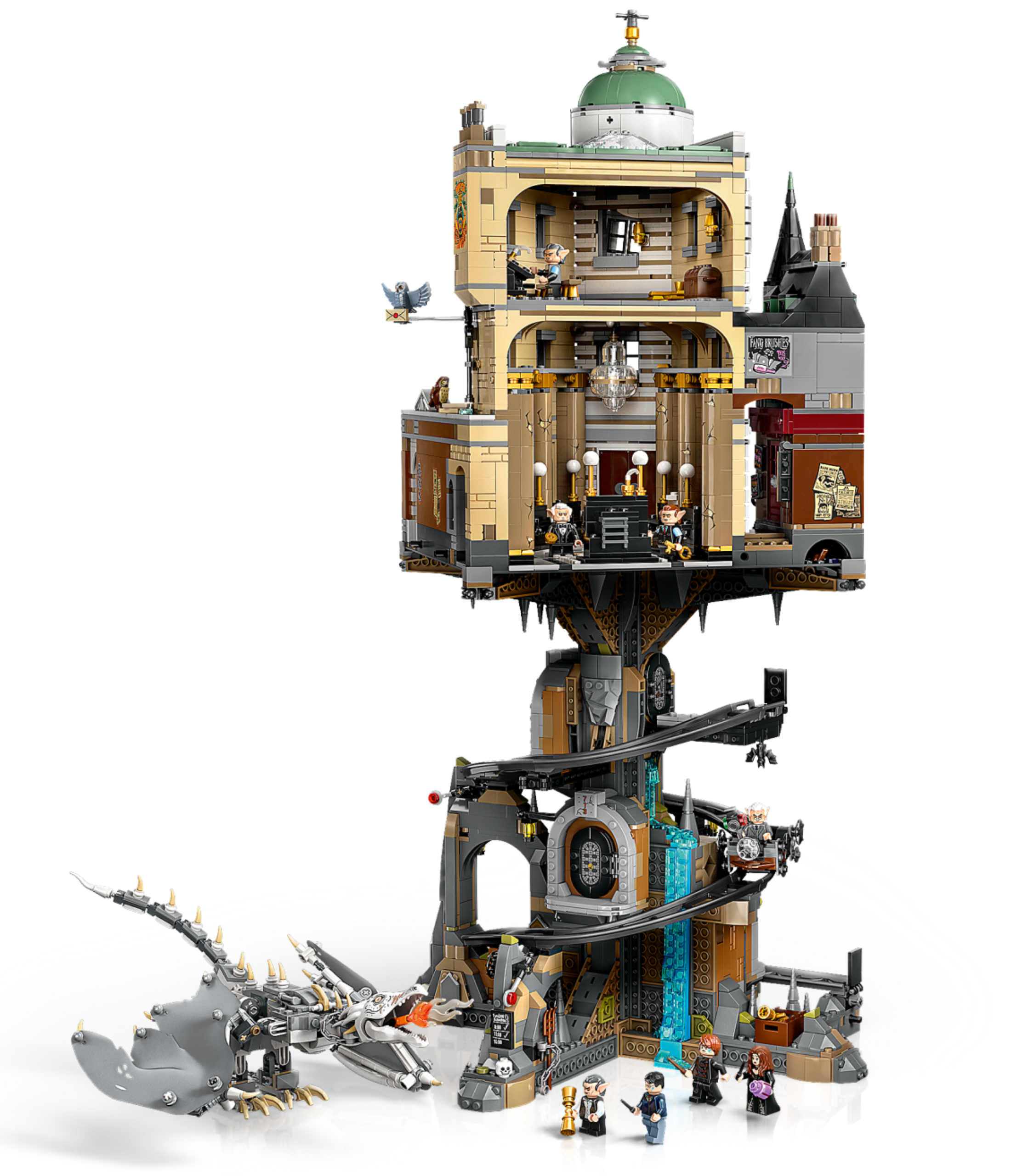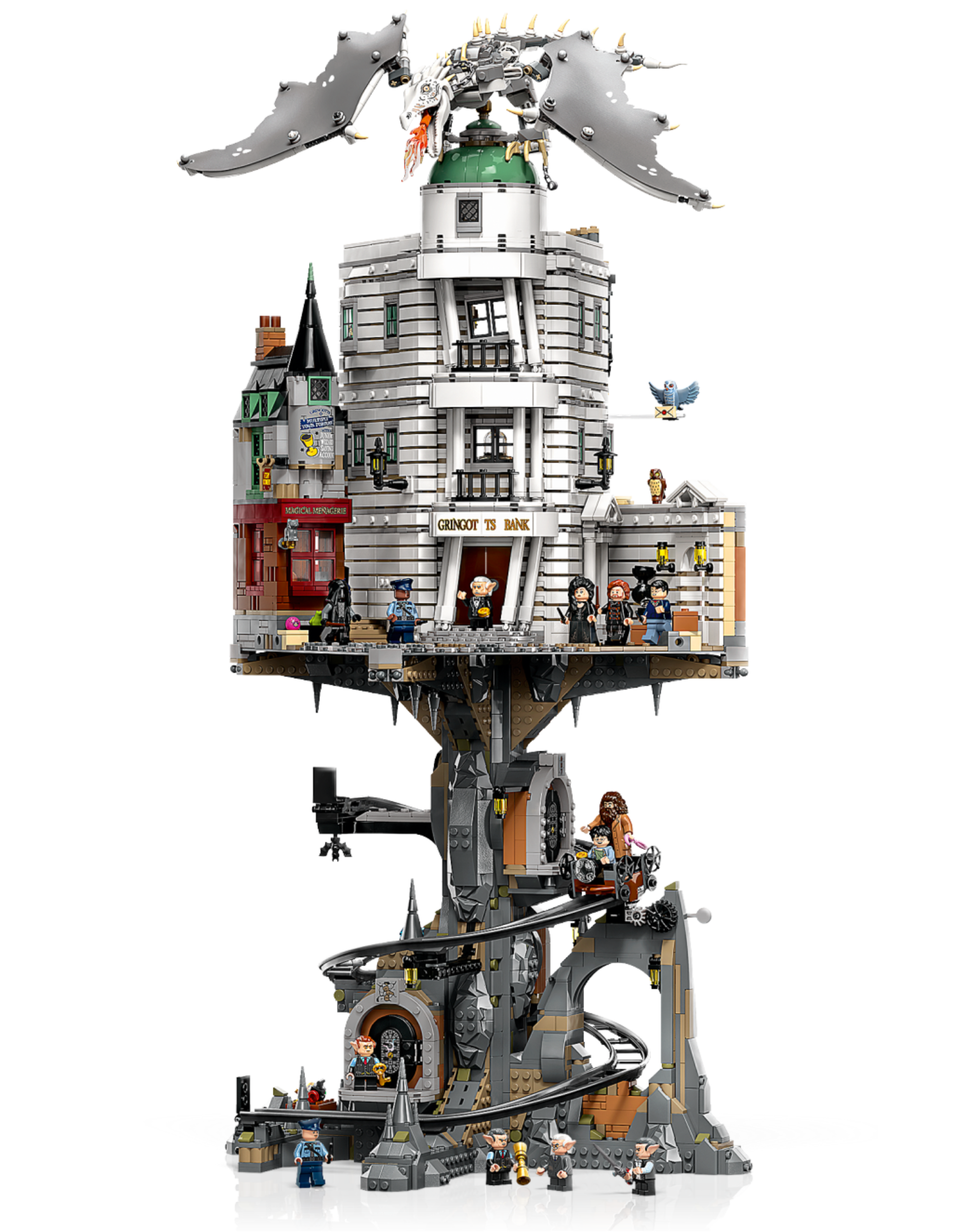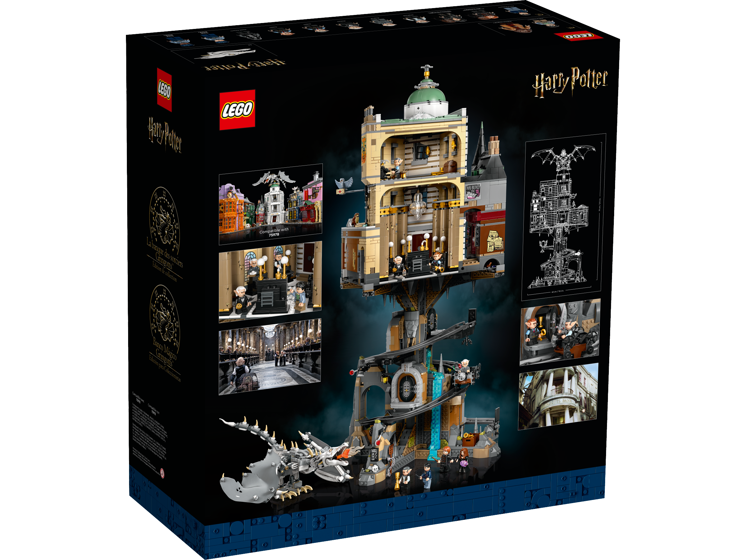 Be transported to the Wizarding World as you build this LEGO® Harry Potter™ Gringotts™ Bank – Collectors’ Edition (76417) set. Recreate the bank’s opulent foyer and mezzanine floor with a safe in the wall to store Hagrid’s secret letter. Construct a spiraling vault cart track with a mechanism that stops the cart at each of 3 underground vaults – including Bellatrix’s vault, which has a magical surprise inside! The set also includes a posable Ukrainian Ironbelly dragon figure and a buildable model of the Magical Menagerie shop.