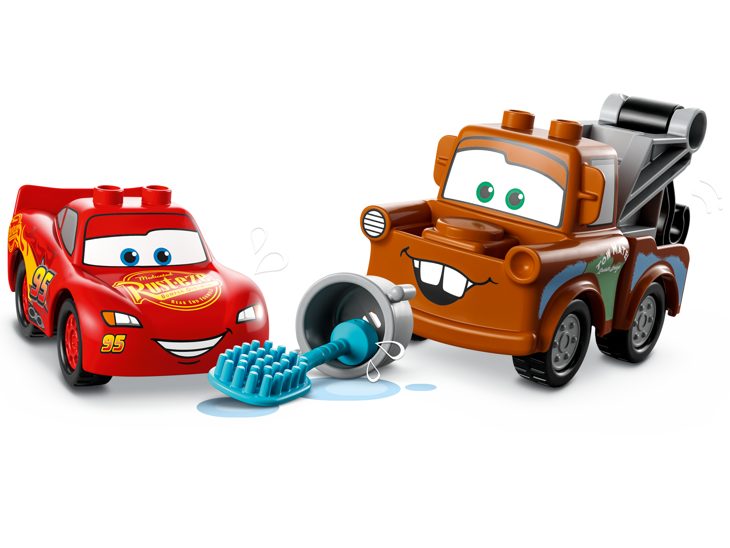 Parents and kids construct a drivable Lightning McQueen, Mater and a car wash together. LEGO DUPLO gifts for kids are great buildable toys for little hands and come with features to develop fine motor skills. This set has a movable washing arm, a spinning tuning table for kids to carry out repairs using the wrench, and Mater can tow Lightning McQueen when kids attach him to his hook. Kids create stories of their own with recognizable characters from the popular film series.