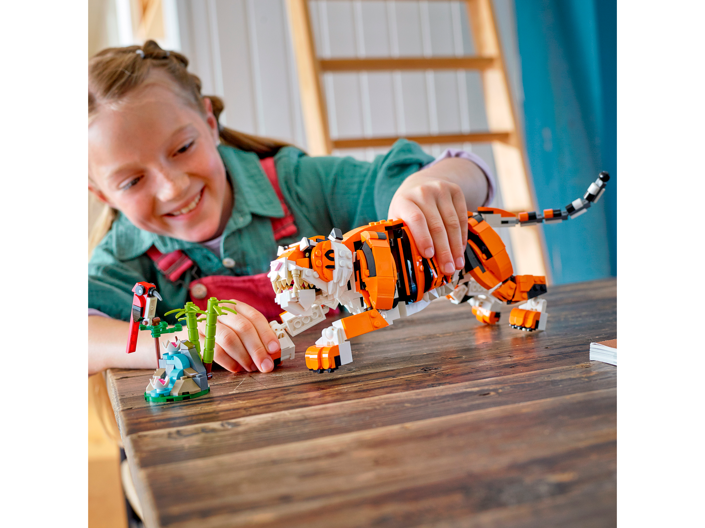 At least 3 different build-and-play experiences are available to kids with this fantastic 3in1 toy set. They can build a posable tiger with a red bird, rebuild it into a posable red panda with bamboo and a bonsai tree, turn it into a koi fish with moving tail and fins and water lilies, or delve into their imaginations to create another animal.