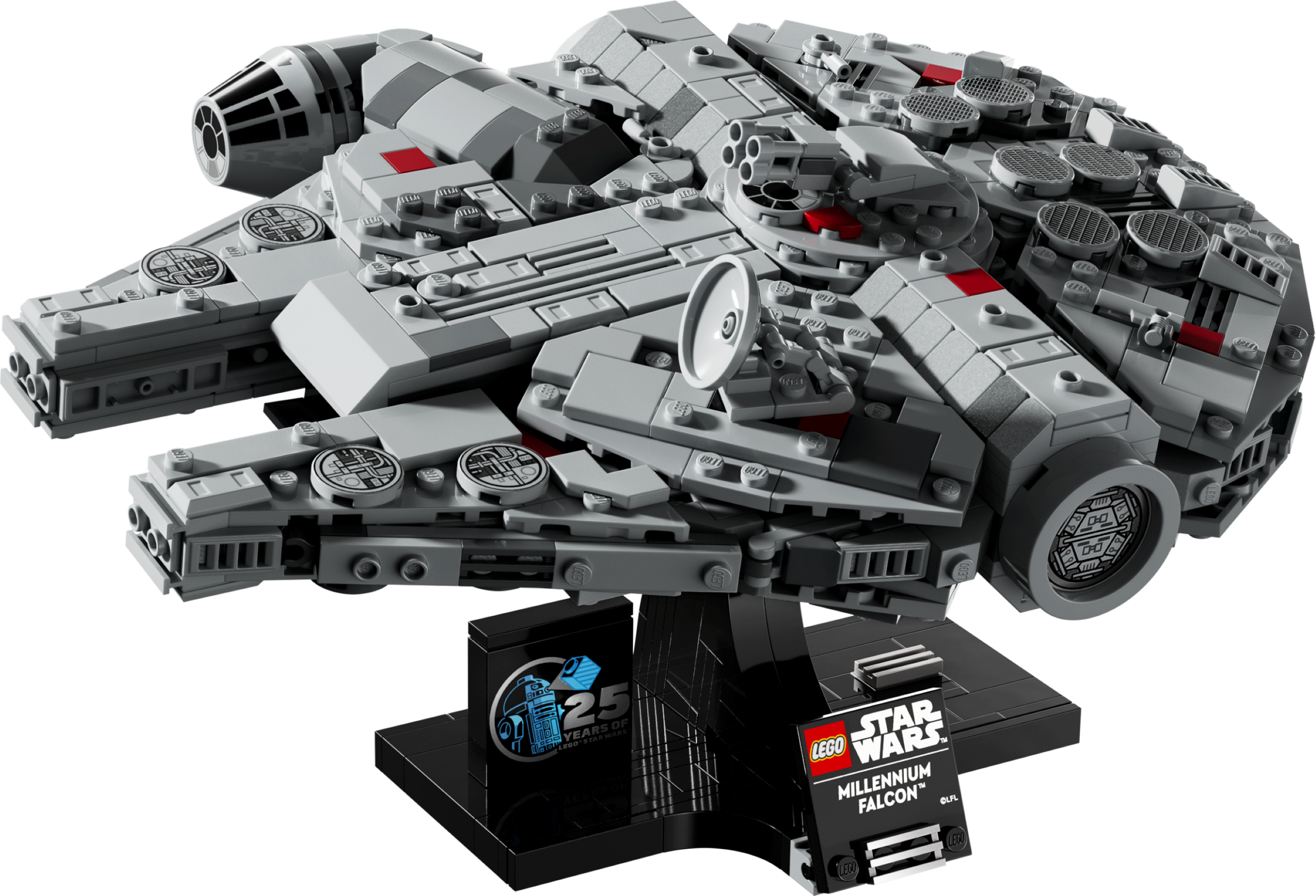 The classic Star Wars™ saga continues in your living room with this collectible LEGO® Star Wars Millennium Falcon build-and-display starship model (75375). Channel Jedi-like focus and mindfulness to recreate authentic details of this iconic starship, as seen in Star Wars: A New Hope. Display your creation on a buildable stand that’s designed to show the Millennium Falcon at a dynamic angle, as if in flight. Add the nameplate and a LEGO Star Wars 25th anniversary brick to complete a centrepiece that is sure to inspire nostalgic memories.