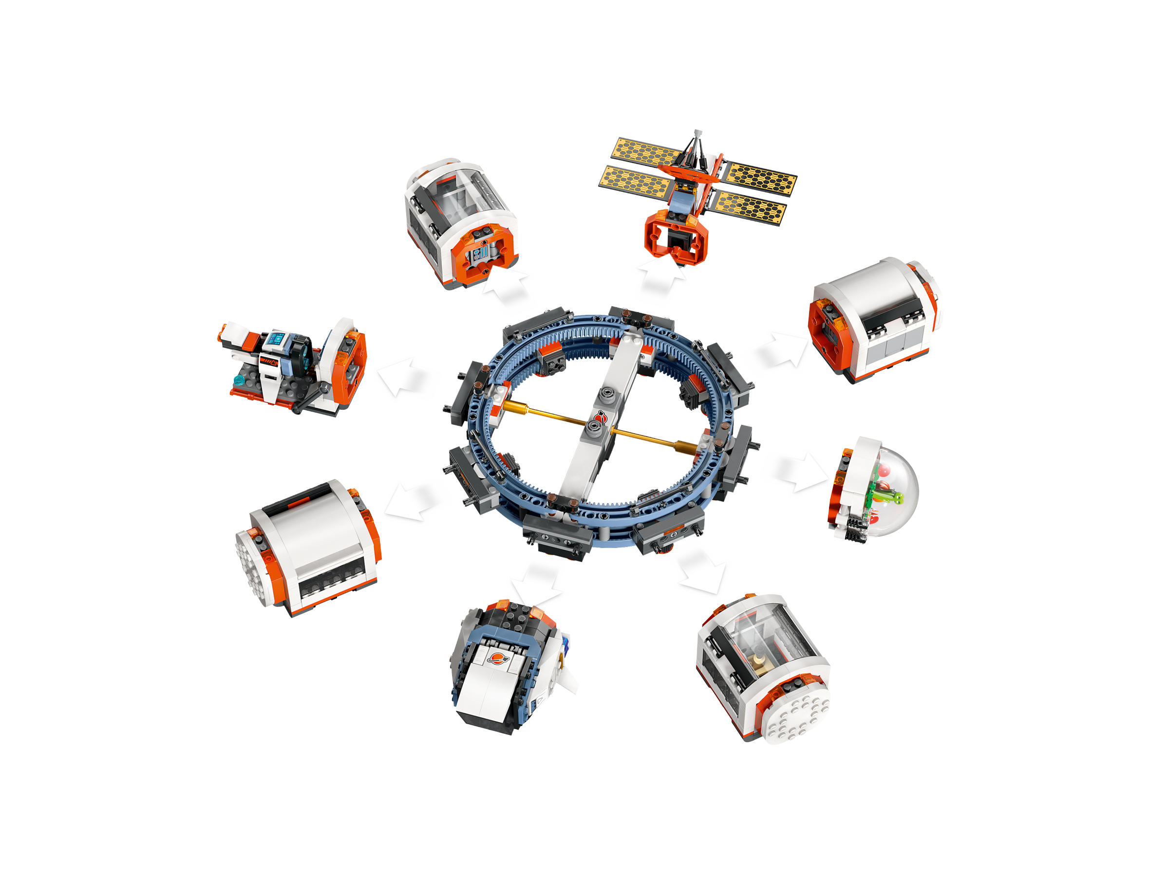 Treat a budding astronaut with the 7 LEGO® City Modular Space Station model playset (60433). This futuristic space ring is an orbiting anchor for docking spacecraft and room pod modules, including a satellite, space bike, shuttle, exploration science lab, repair workshop, kitchen, sleeping quarters and a biodome. Kids can switch the modules around to create their perfect space station and connect them to the shuttle to create a cool space train. The set also features 6 space crew minifigures for epic space adventures.