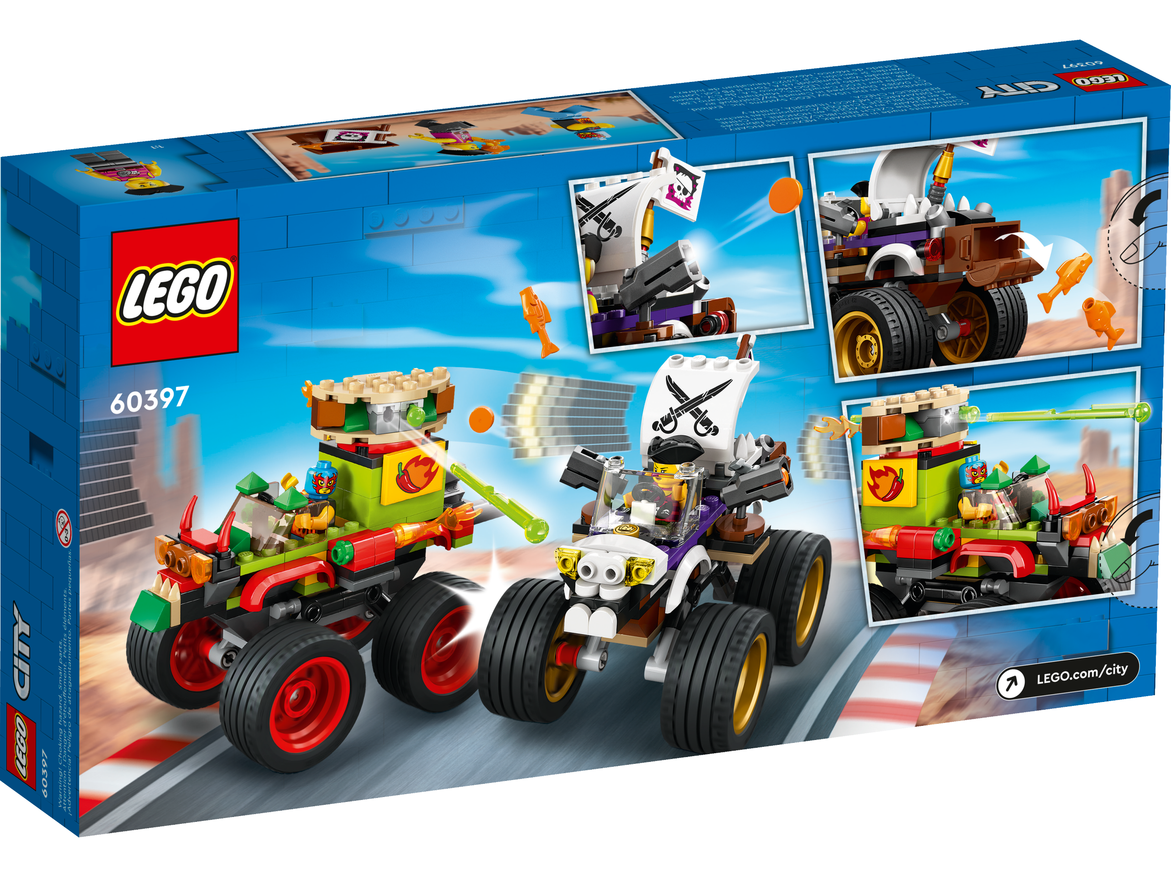 Fans of toy cars and the LEGO® 2KDRIVE video game can enjoy endless hours of fun with this 7 LEGO City Monster Truck Race (60397) playset, including 2 funny monster trucks with cool functions, as featured in the game. Kids can enjoy hands-on 2KDRIVE action or stage their own epic races between the taco and pirate driver minifigures.