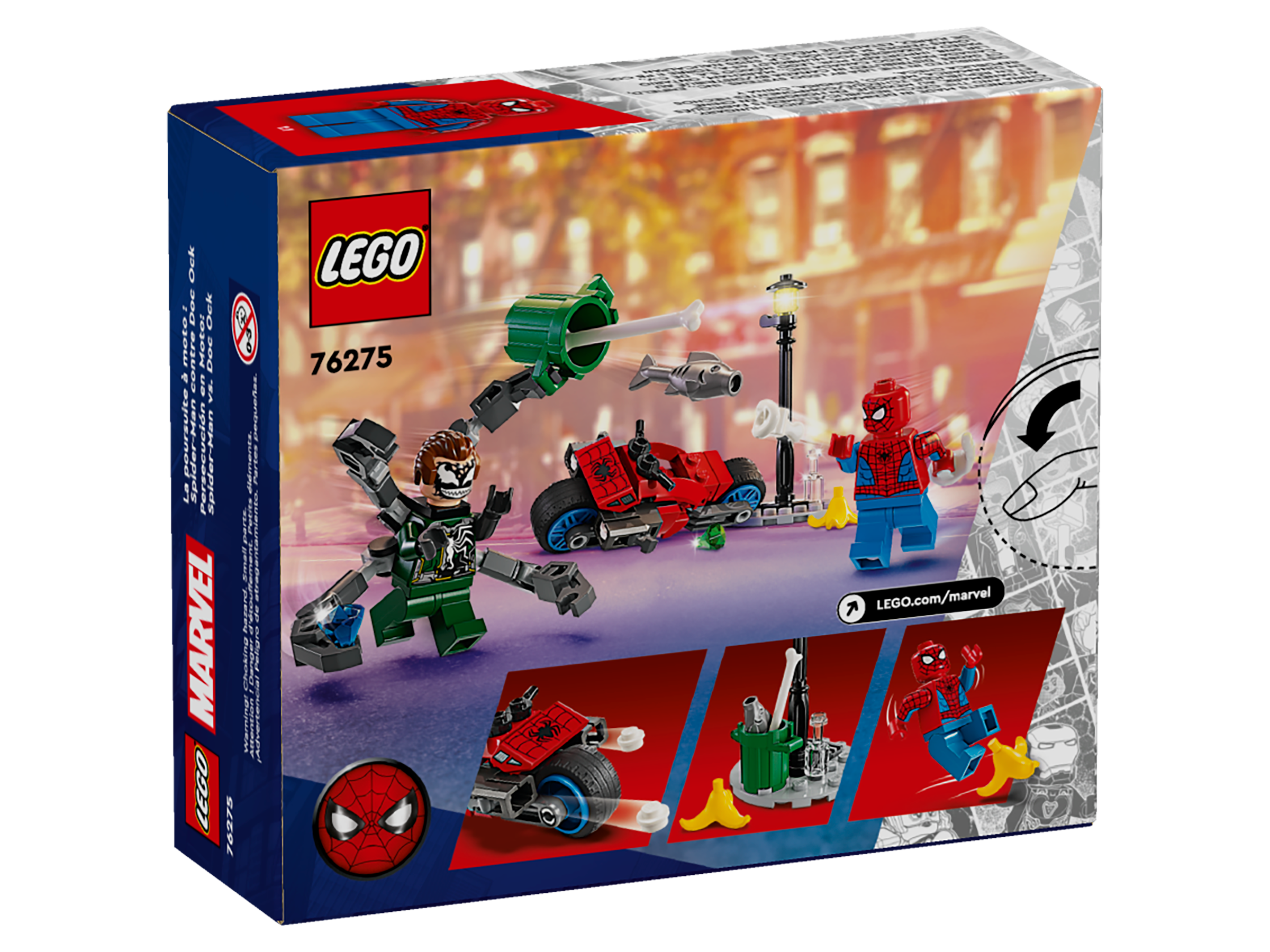 This supercharged set features a Venomised villain and a motorcycle-riding Spider-Man. LEGO® Marvel Motorcycle Chase: Spider-Man vs. Doc Ock (76275) is a buildable Spider-Man toy packed with cool extras for Super Hero fans aged 6 and over.