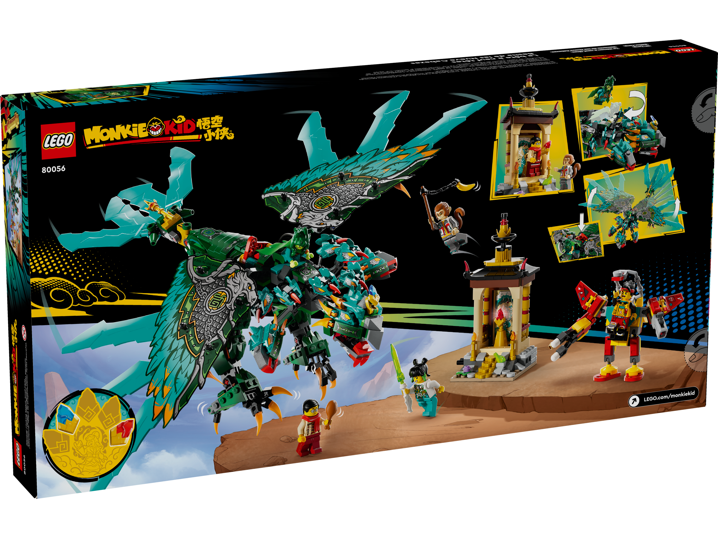 High-flying action awaits kids and fans aged 9 in this Nine-Headed Beast (80056) LEGO® Monkie Kid™ fantasy gift creative playset. This toy features a bird monster action figure with 9 heads, moving wings, legs, necks and tail, as well as an opening beak on the main head of the mythical creature. The imaginative play toy includes small temple and mini-mech builds, plus other story starters, along with 2 Color Stones and Nine-Headed Demon, Monkey King, Mei, Mr. Tang and Monkie Kid minifigures. The mini-mech features a jetpack, shooter and gripping functions.