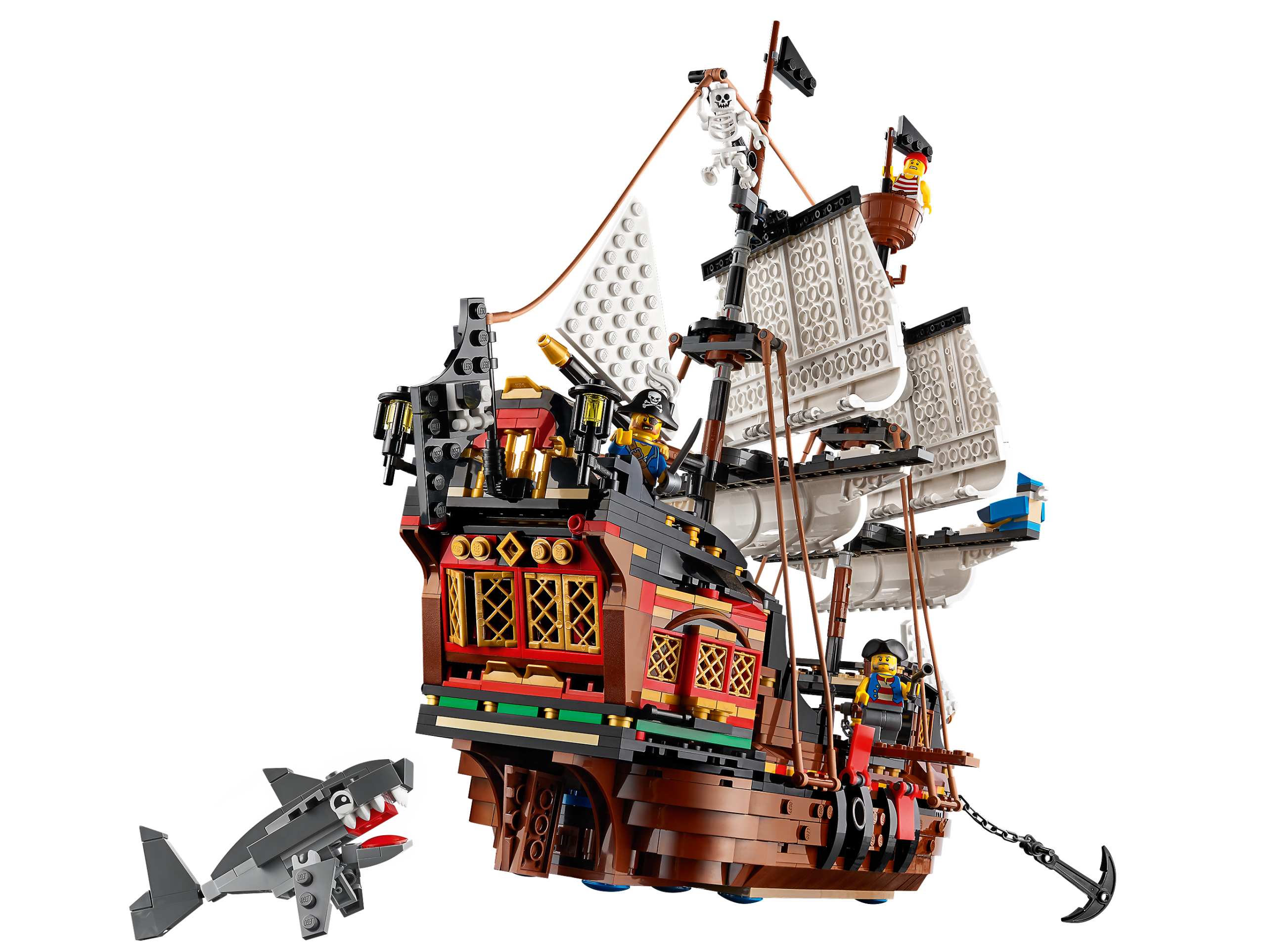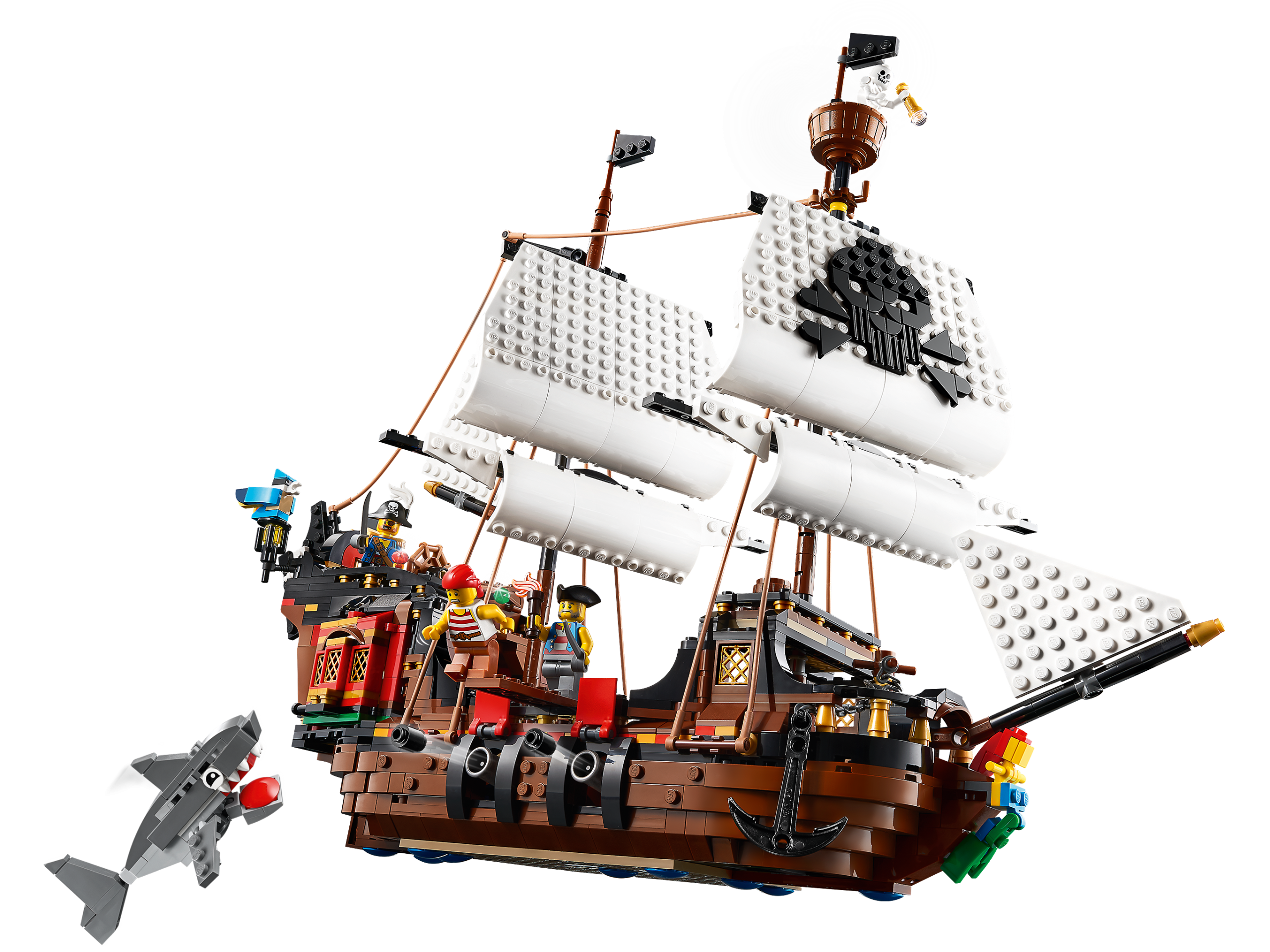 The high seas are calling! Swashbuckling adventures await pirate fans in the LEGO® Creator 3in1 Pirate Ship (31109) toy. This awesome, detailed set features a pirate ship with moving sails, cannons and a cabin with opening roof and sides, 3 minifigures, buildable figures including a shark and a parrot.