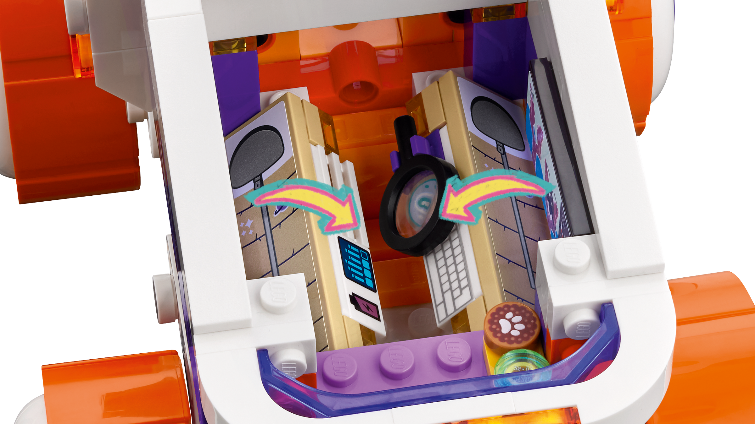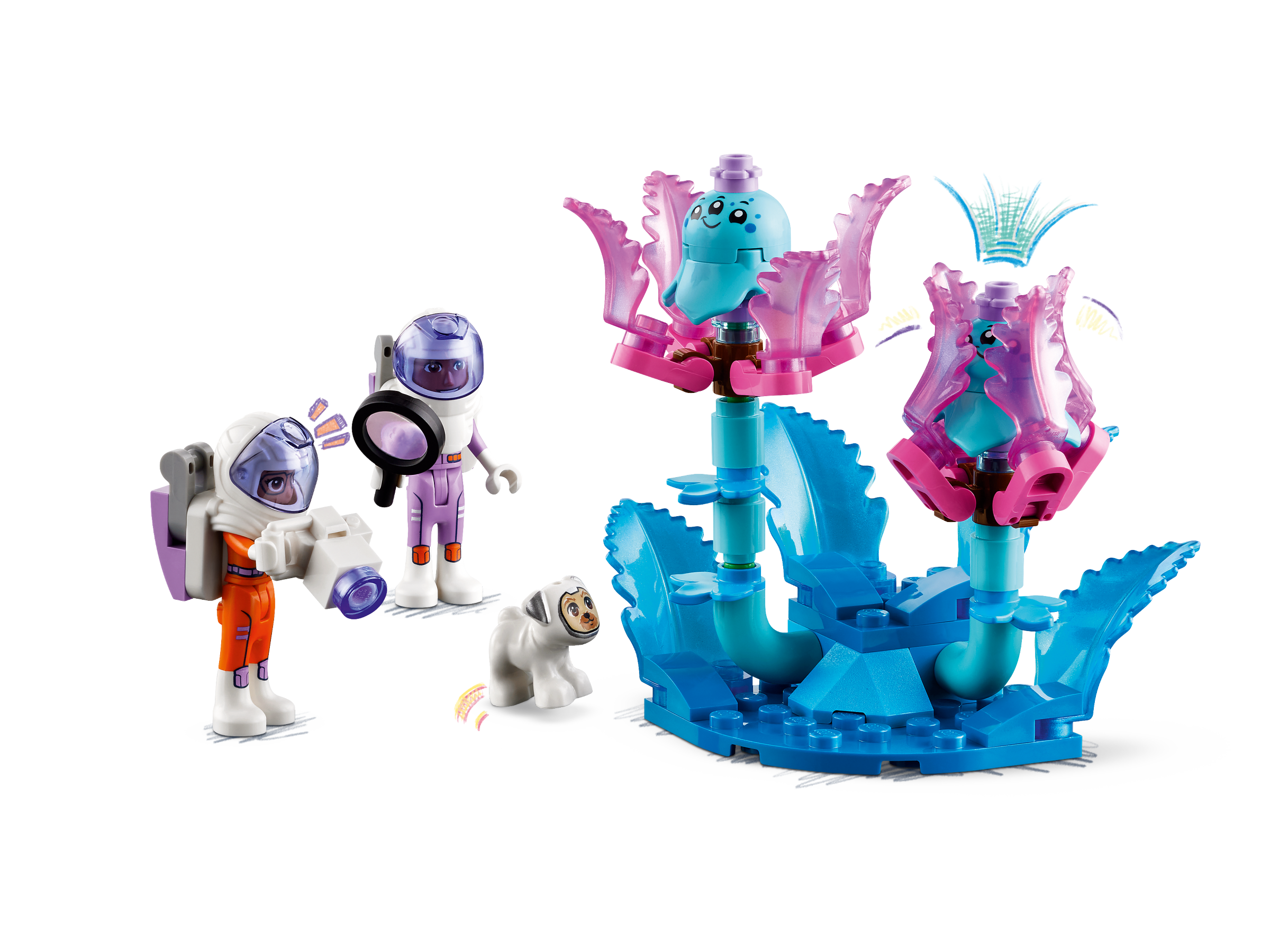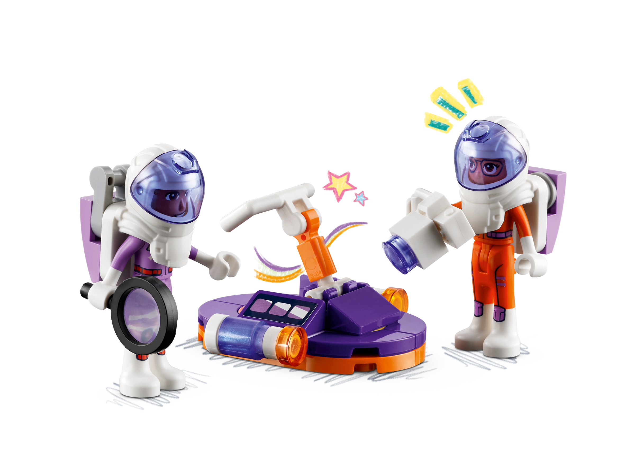 Kids can place a character into the cabin and steer the space rover into position beforeextending the arm to capture evidence of alien life on the toy camera. The back opens to reveal the research area, where there are fold-down beds, plus a bed and food for the dog. Open the flowers with care – maybe this is where the aliens are hiding!