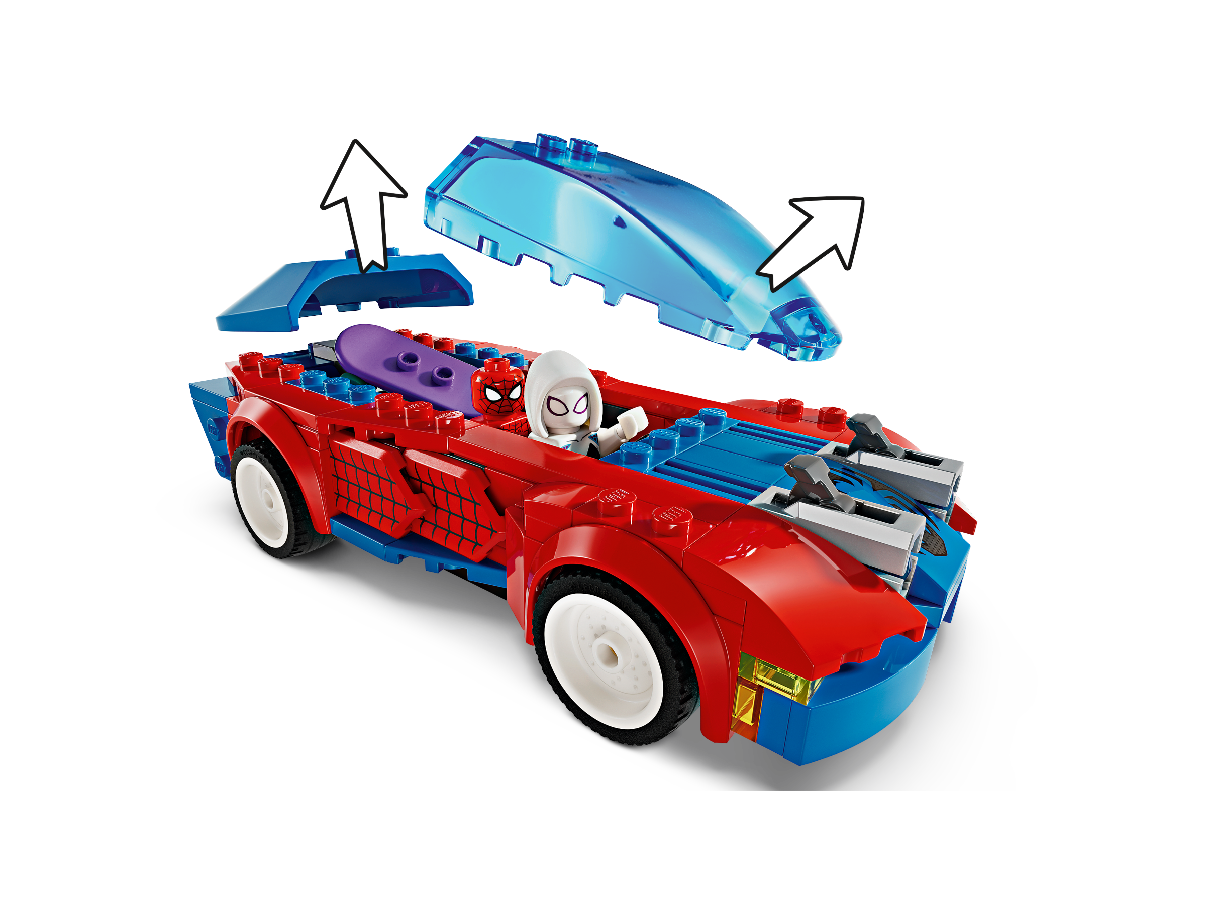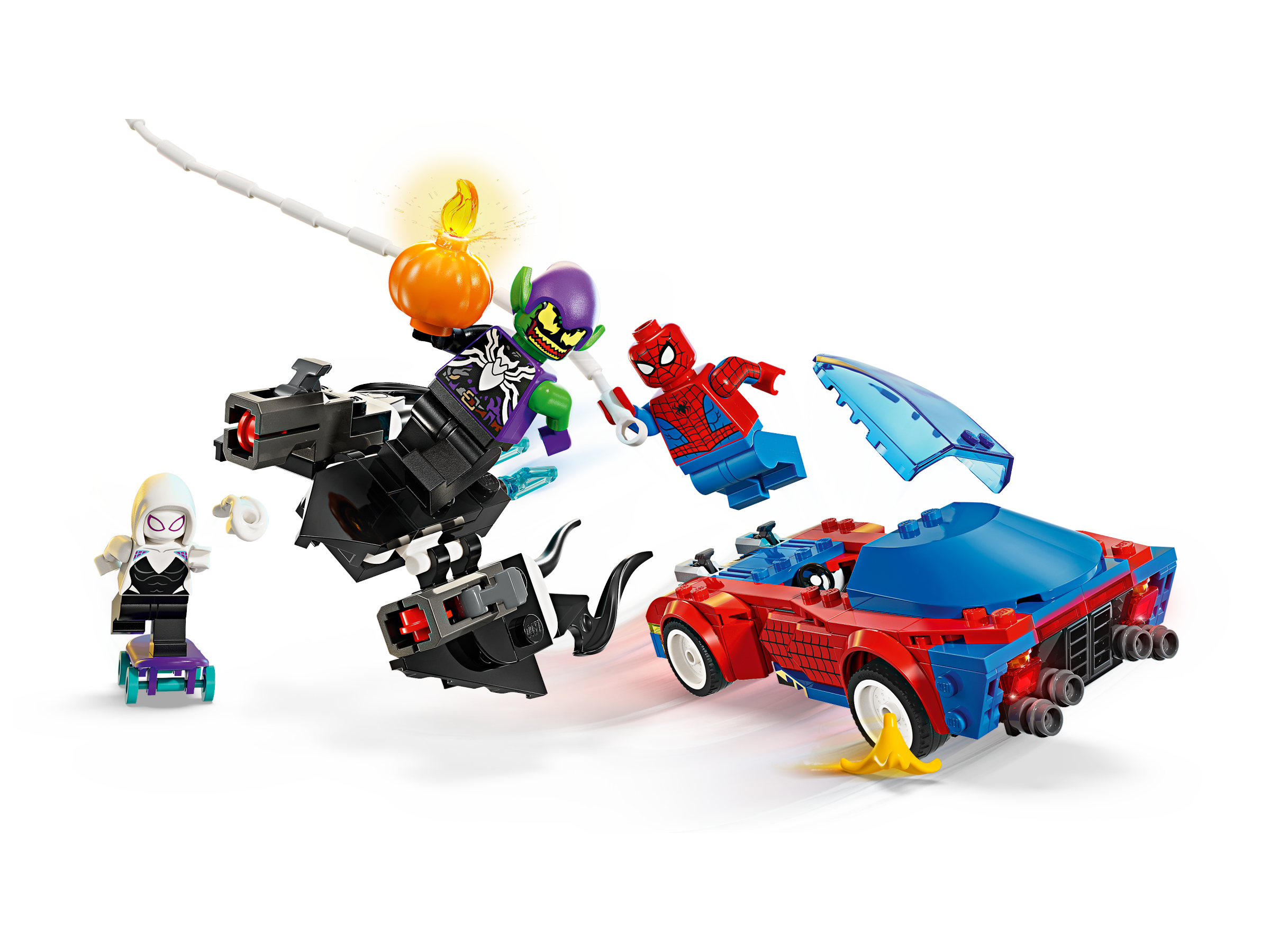 Spider-Man, Ghost-Spider and Venom Green Goblin engage in fast-moving battle action using an awesome assortment of vehicles, weapons and accessories. Spider-Man’s car has 2 front stud shooters, Green Goblin’s glider has 2 stud shooters and he carries pumpkin bombs, and Ghost-Spider uses 2 hand web blasters as she rides her skateboard. Spider-Man swings on a flexible web ‘rope’ and uses a large, bendable web to capture villains. Removable sections give access to the car’s interior, which is big enough to hold 2 minifigures and the skateboard. For added digital fun, builders can zoom in, rotate models in 3D and track their progress using the fun, intuitive LEGO Builder app.