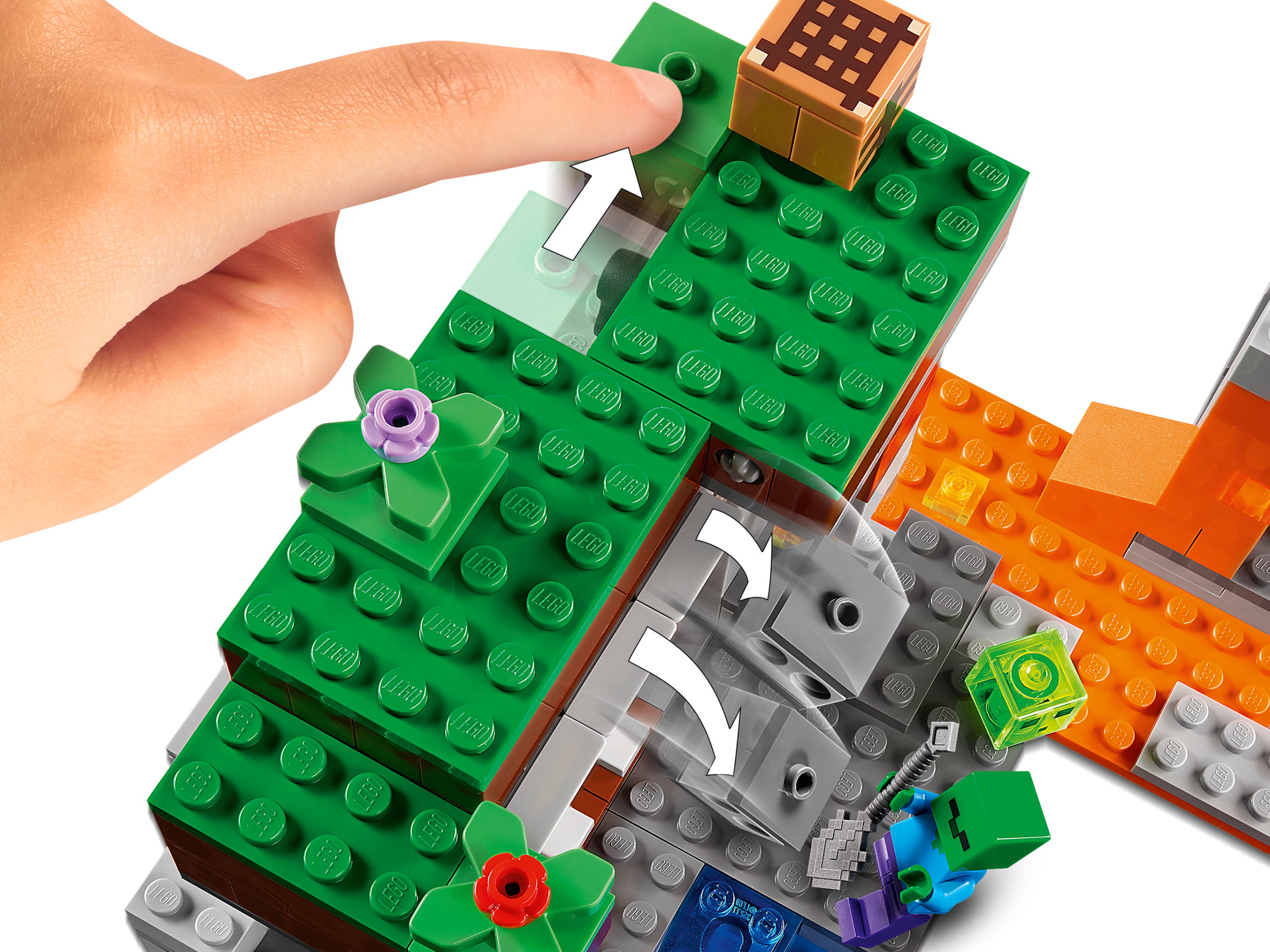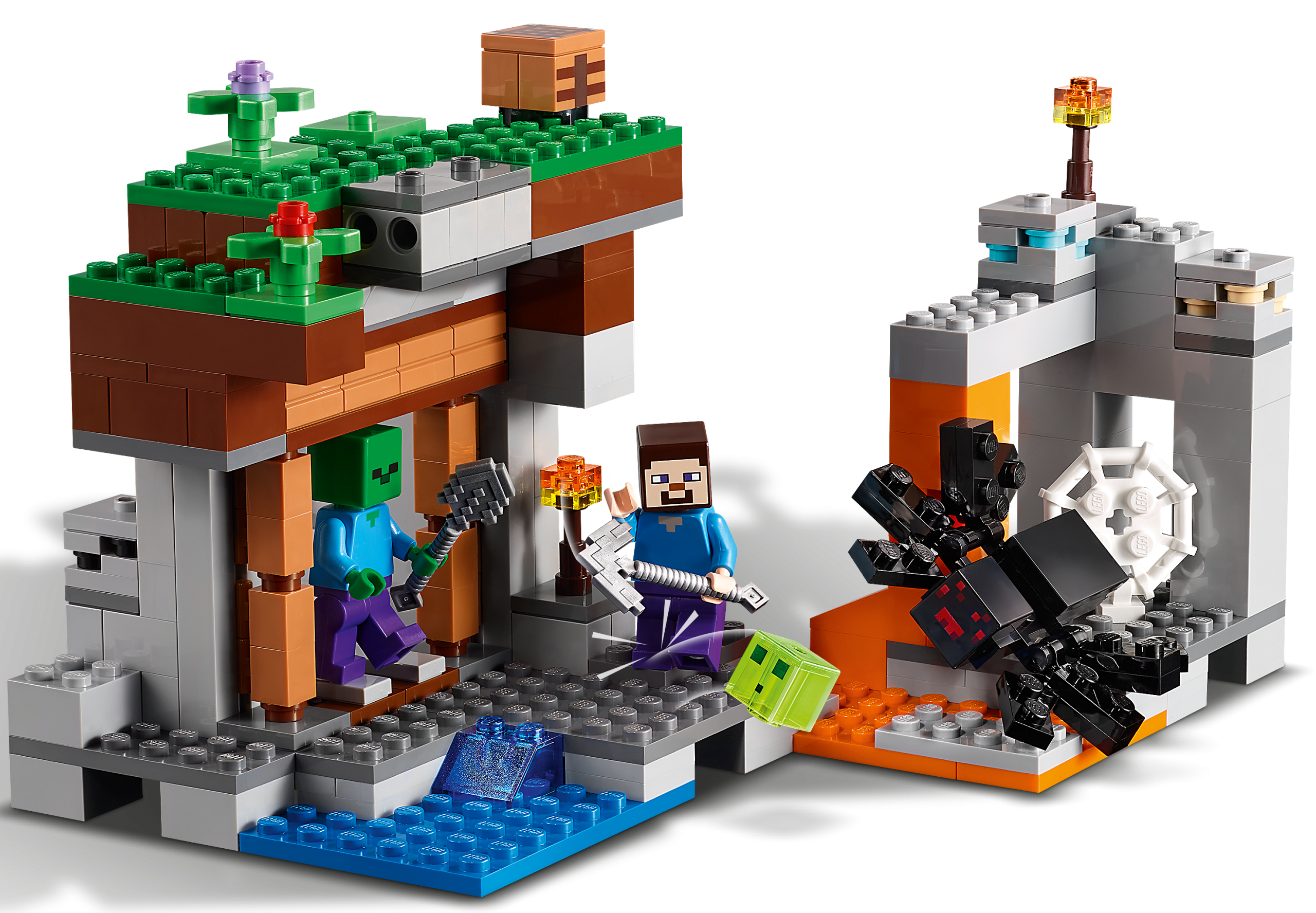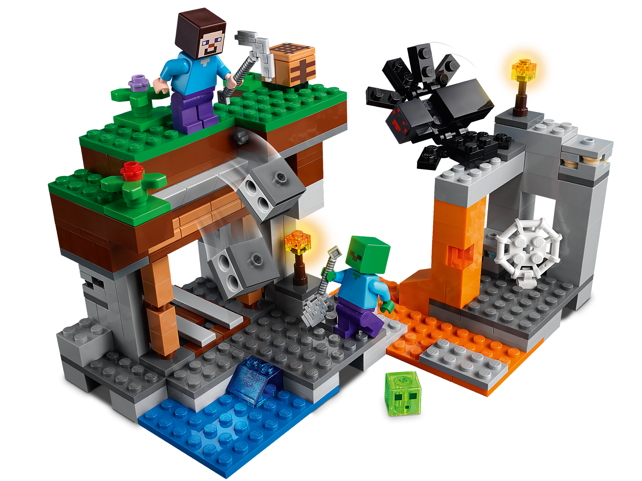 Kids join Steve as he attempts to unearth coal, iron and diamond – while under attack from a scary zombie, creepy spider and living slime. Players must lure the hostile creatures to the cave entrance, then use ahand-operated device to bring the high-level gravel crashing down on them.
