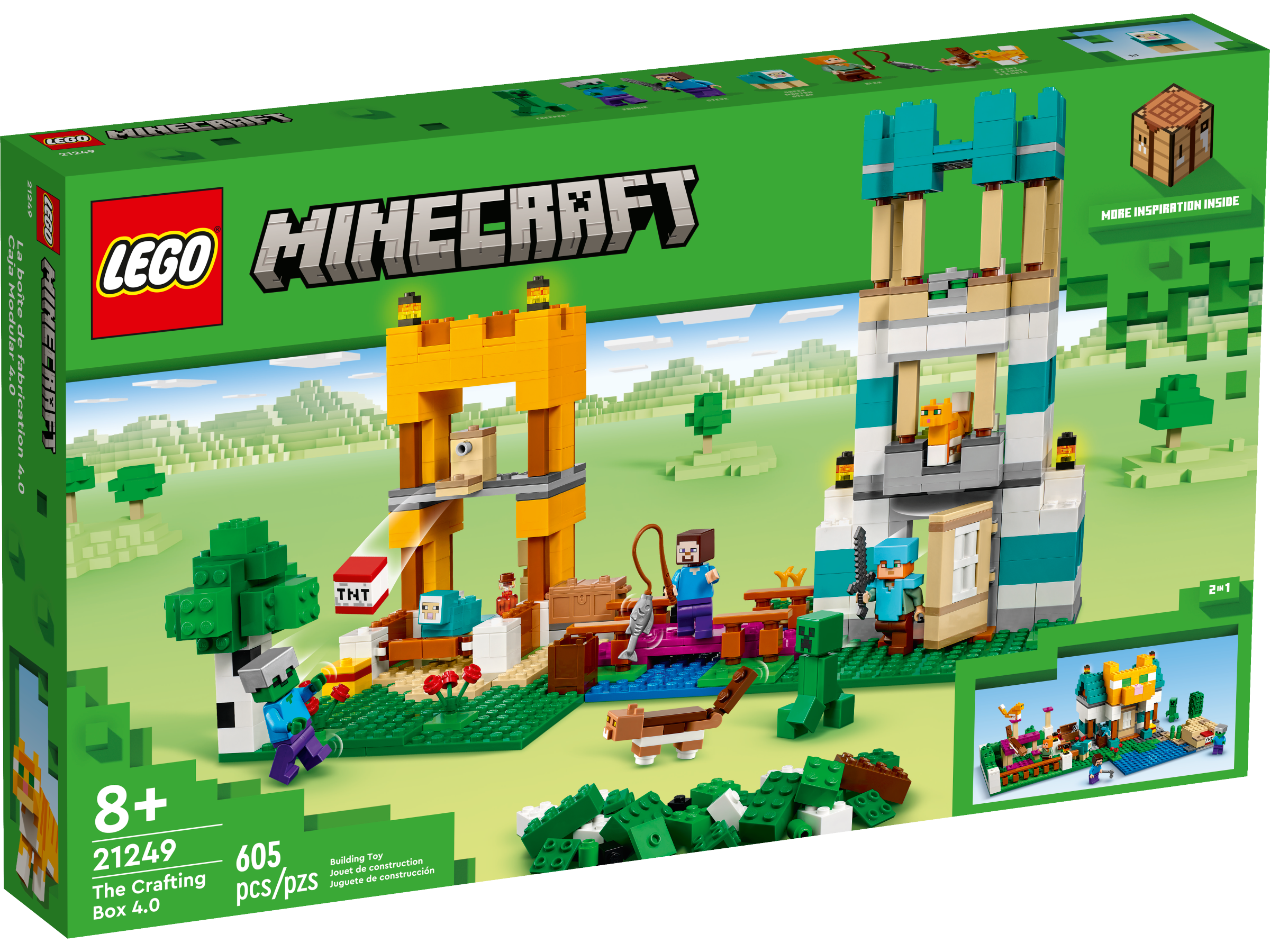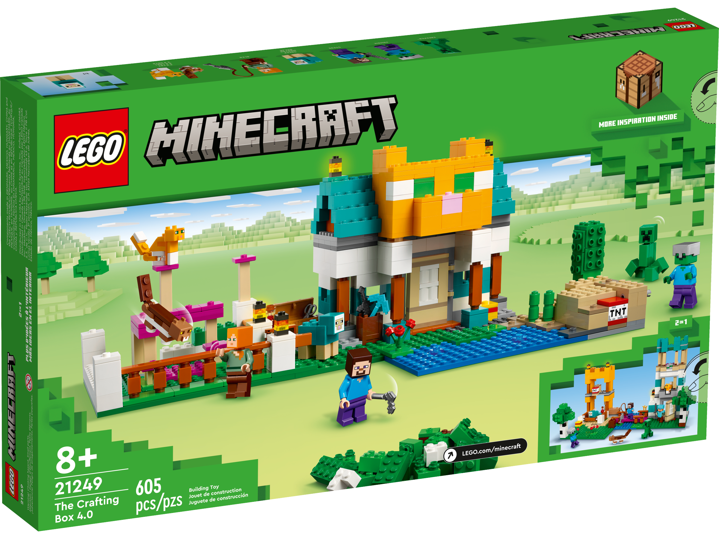 LEGO® Minecraft® The Crafting Box 4.0 (21249) puts 2 standout playsets and endless free-building fun into the hands of Minecraft players aged 8 and up.