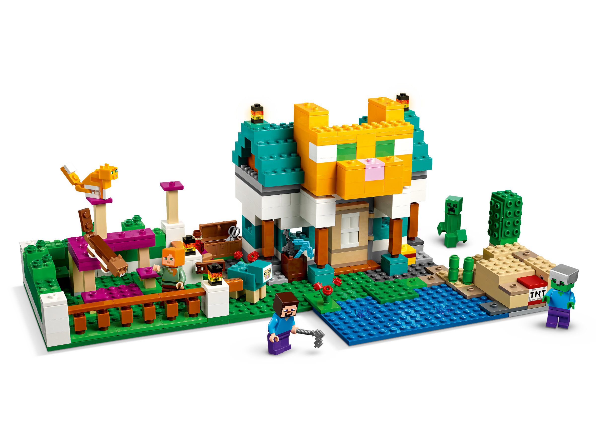 This endlessly versatile playset offers 2 different scenarios for kids to build: the River Towers, a fortress-like structure that can be used to defend against a zombie and Creeper™ attack; or the Cat Cottage, which consists of a large, cat-shaped house with a cat playground next to it. These distinct builds, along with suggested models designed to inspire kids’ creativity and the countless structures they build from their own imaginations, are populated by iconic figures and mobs from the game, including Steve, Alex, a zombie, Creeper, cats and sheep. A host of Minecraft features and functions, including exploding TNT, bring extra realism to this epic playset. For added digital fun, builders can zoom in and rotate sets in 3D and track their progress using the fun, intuitive LEGO Builder app.
