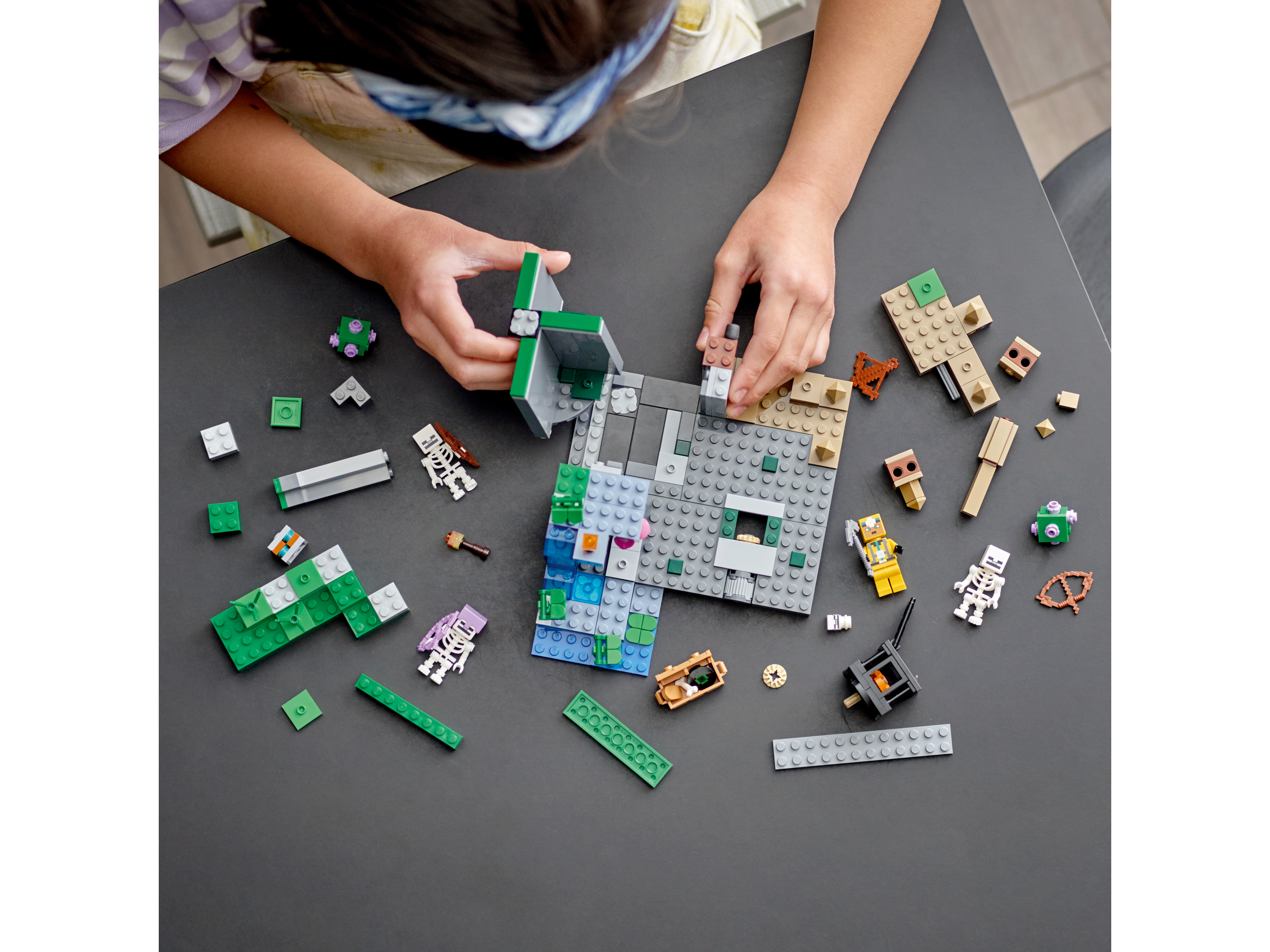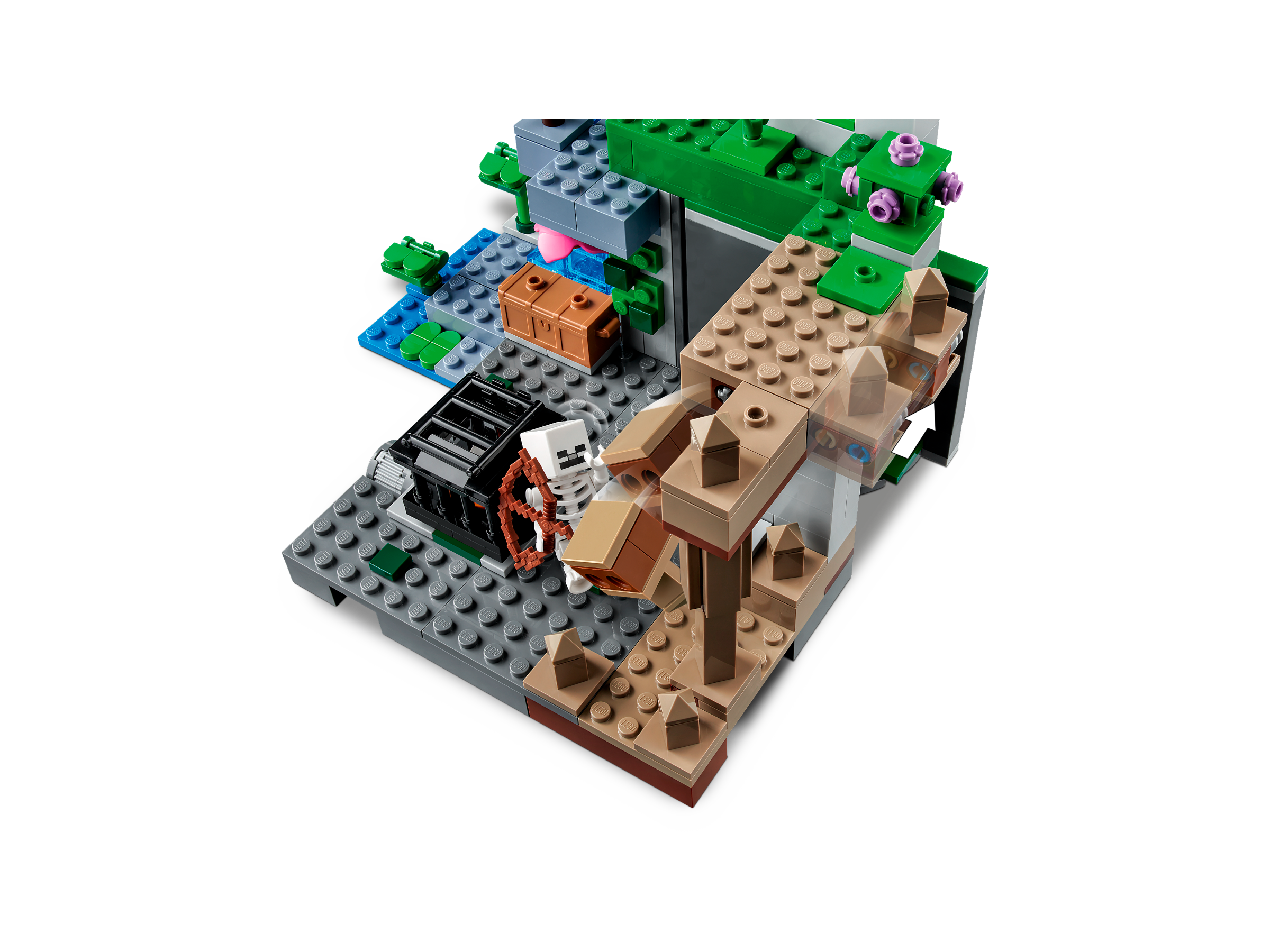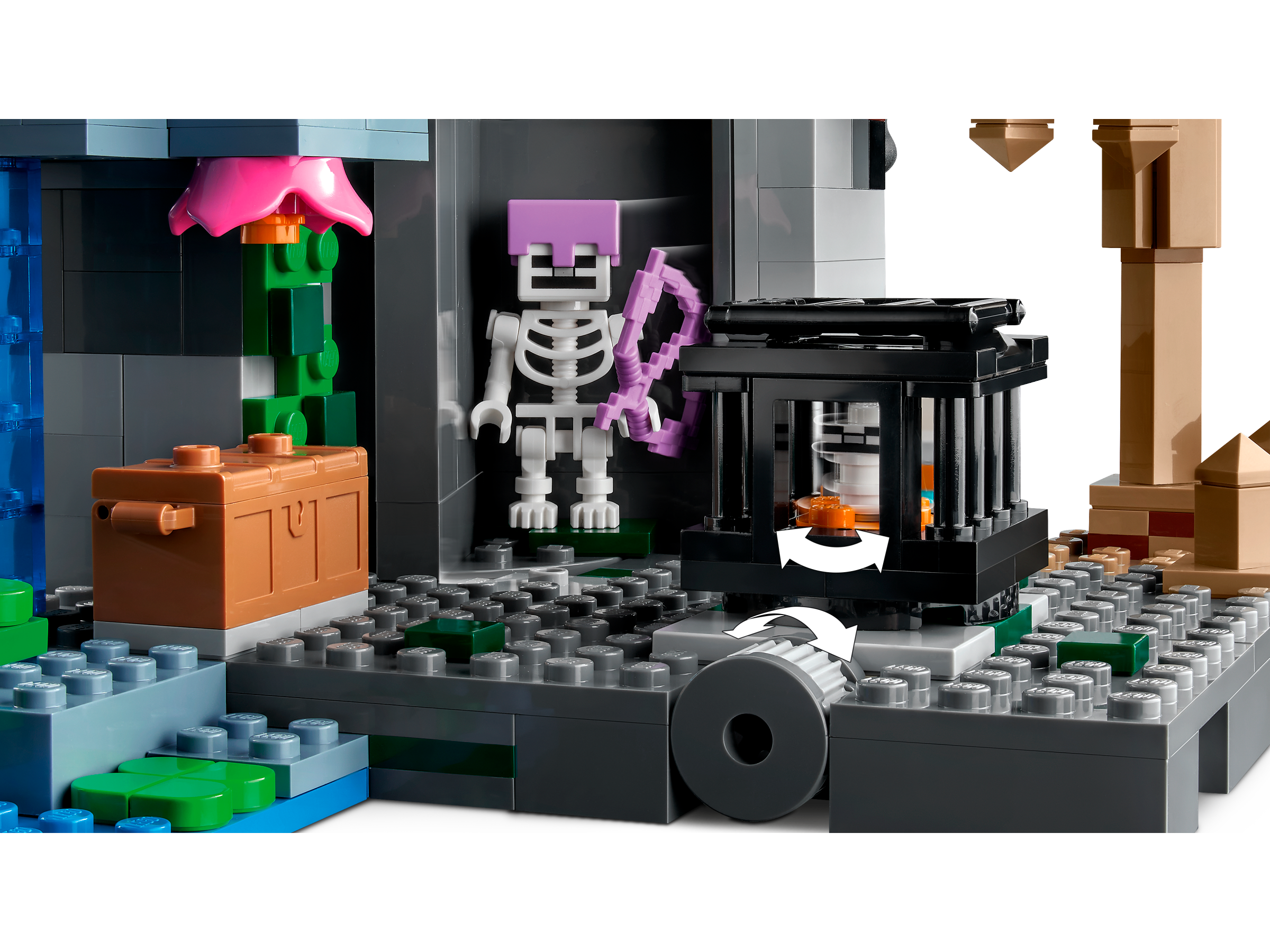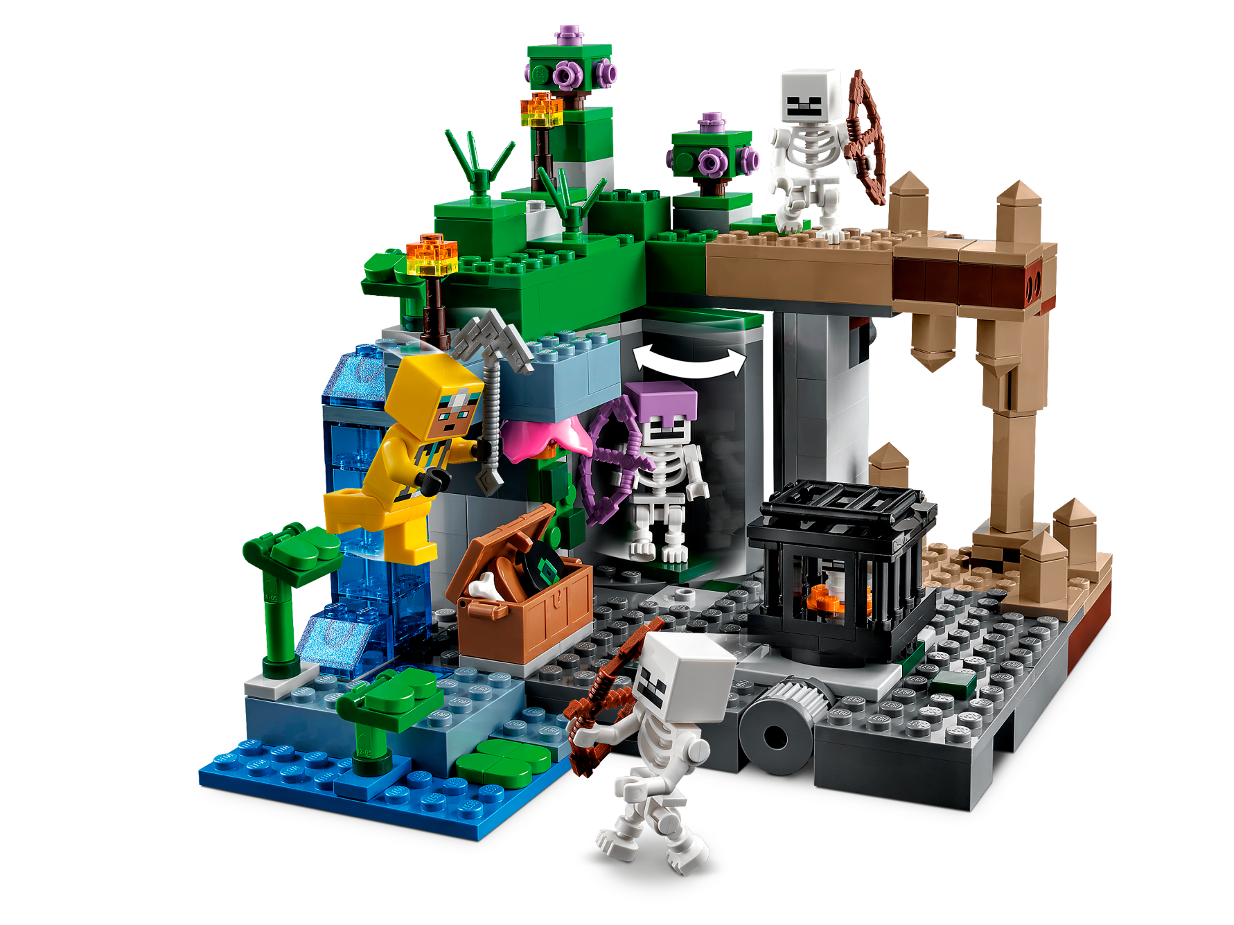 This versatile playset pits a cave explorer against hostile skeletons in a multi-biome environment comprising a dripstone cave with stalagmites and stalactites; a lush cave with bushes, vines, water, clay and torches; and the skeletons’ dungeon, which includes a spinning skeleton spawner. Hands-on action includes pushing a stalagmite tomake rocks crash down onto the hostile mobs and rotating a wall to reveal a third skeleton. Weapons include a crossbow and pickaxe, and there’s also a chest containing a music record, bread and a bone. There’s everything a Minecraft player needs to enjoy endless creative adventures!